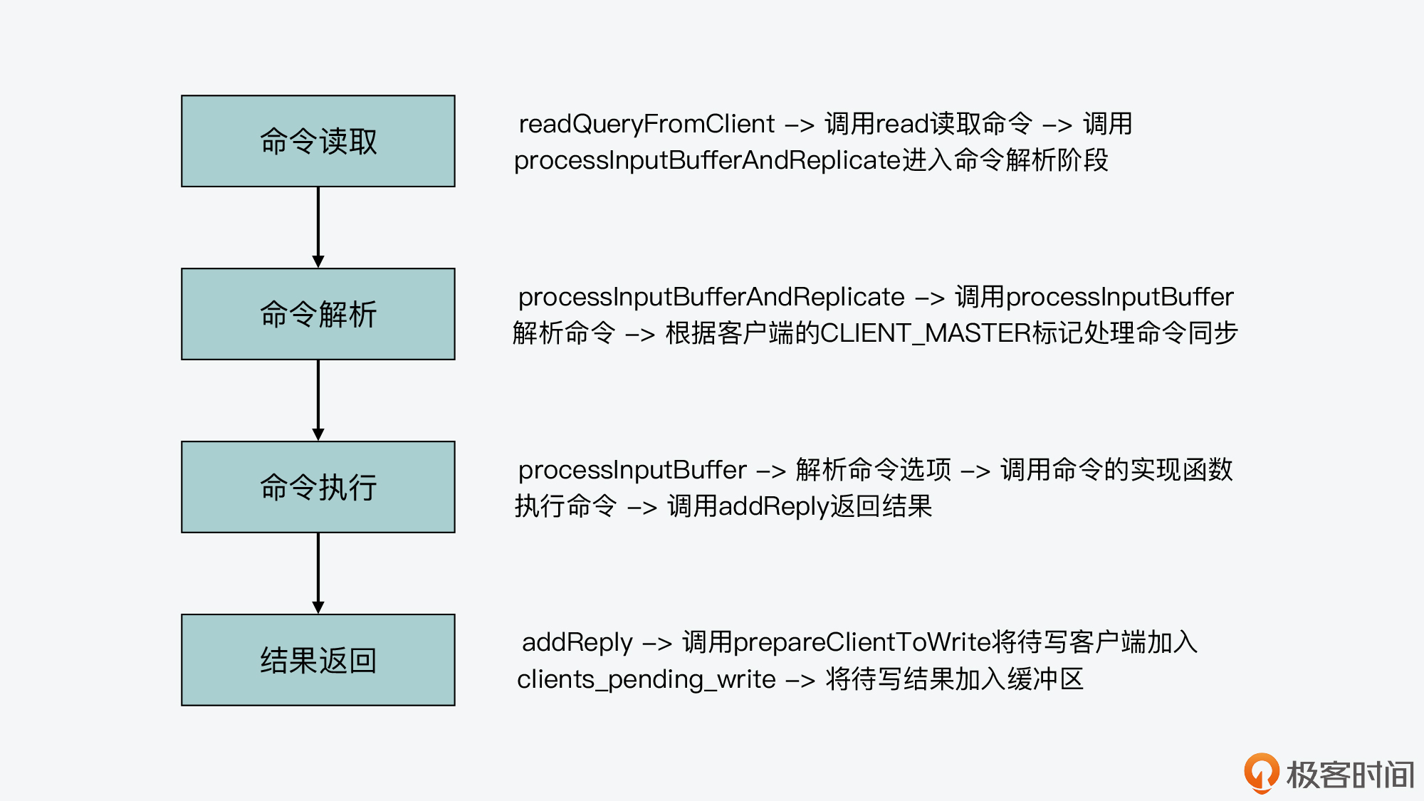 现在我们知道,Redis server一旦和一个客户端建立连接后,就会在事件驱动框架中注册可读事件,这就对应了客户端的命令请求。而对于整个命令处理的过程来说,我认为主要可以分成四个阶段,它们分别对应了Redis源码中的不同函数。这里,我把它们对应的入口函数,也就是它们是从哪个函数开始进行执行的,罗列如下: