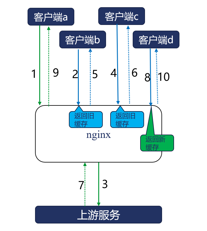 当1个请求回源更新时,其余请求将会默认等待,如果5秒(可由proxy_cache_lock_timeout修改)后缓存依旧未完成更新,这些请求也会回源,但它们的响应不会用于更新缓存。同时,第1个回源请求也有时间限制,如果到达5秒(可由proxy_cache_lock_age修改)后未获得响应,就会放行其他并发请求回源更新缓存。