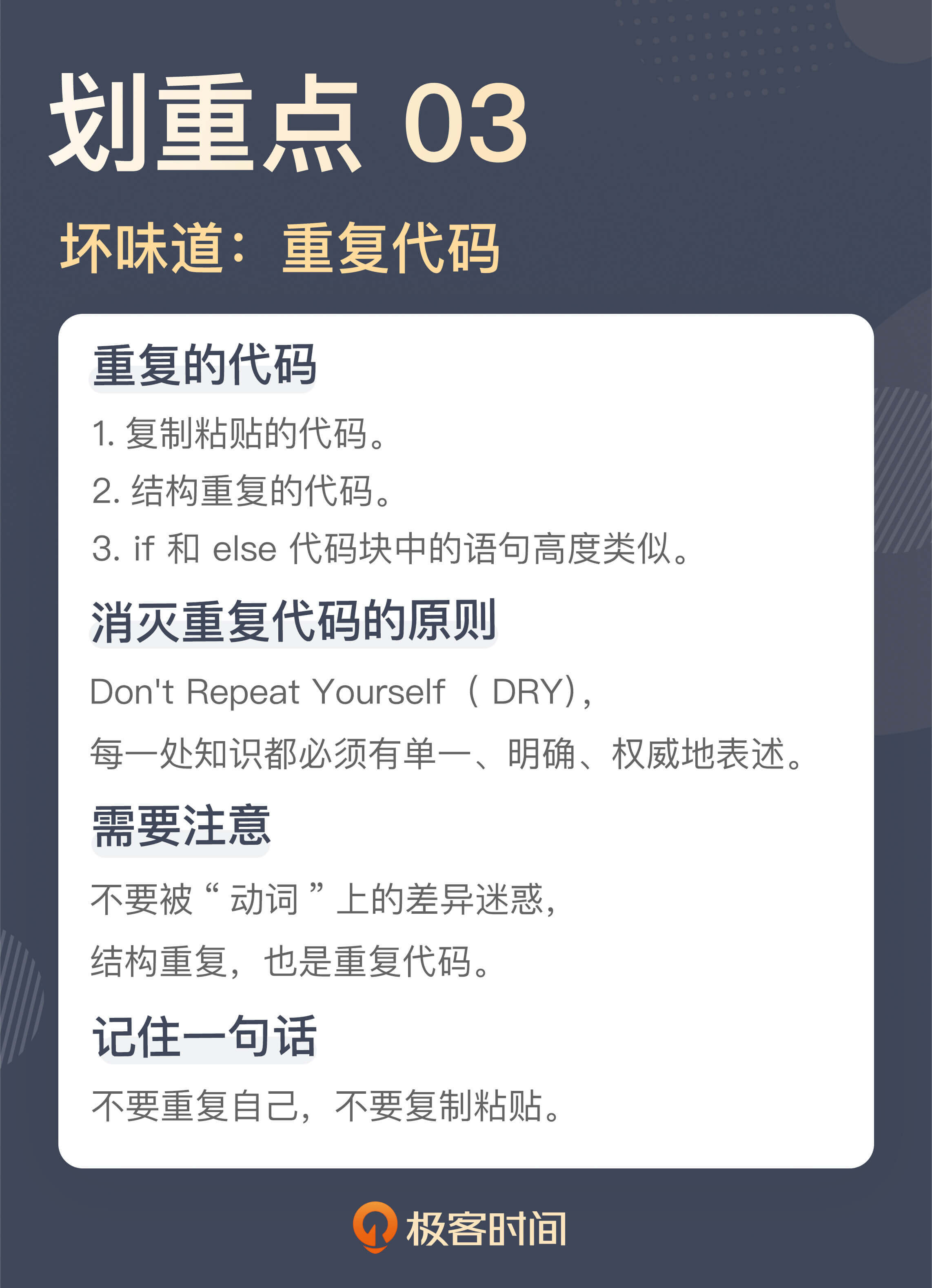 重复是一个泥潭,对于程序员来说,时刻提醒自己不要重复是至关重要的。在软件开发里,有一个重要的原则叫做 Don’t Repeat Yourself(不要重复自己,简称 DRY),我在《软件设计之美》中也讲到过它,而更经典的叙述在《程序员修炼之道》中。