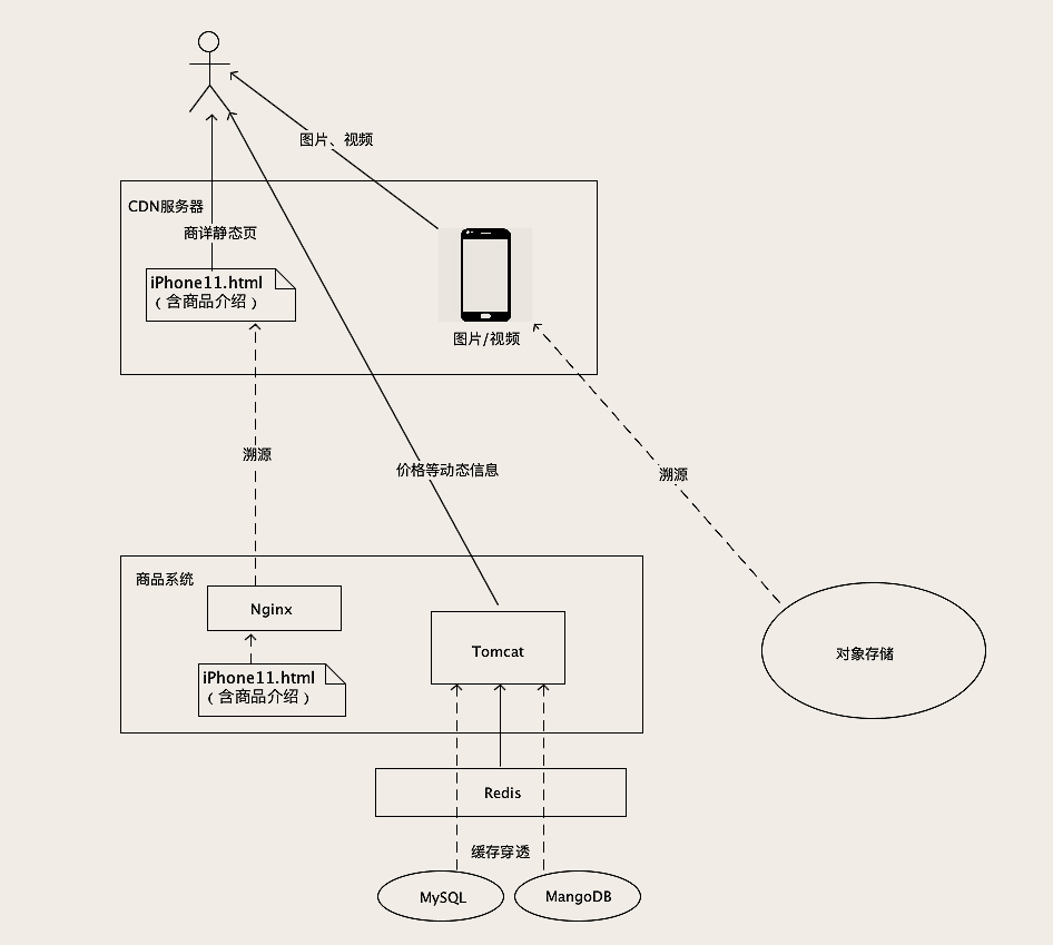 一起来看一下图,这样一个商品系统的存储最终的效果是什么样的?图中实线表示每访问一次商详页,需要真正传输的数据,虚线表示当商详页数据发生变化的时候才需要进行一次数据传输。用户打开一个SKU的商详页时,首先去CDN获取商详页的HTML,然后访问商品系统获取价格等频繁变化的信息,这些信息从Redis缓存中获取。图片和视频信息,也是从对象存储的CDN中获取。