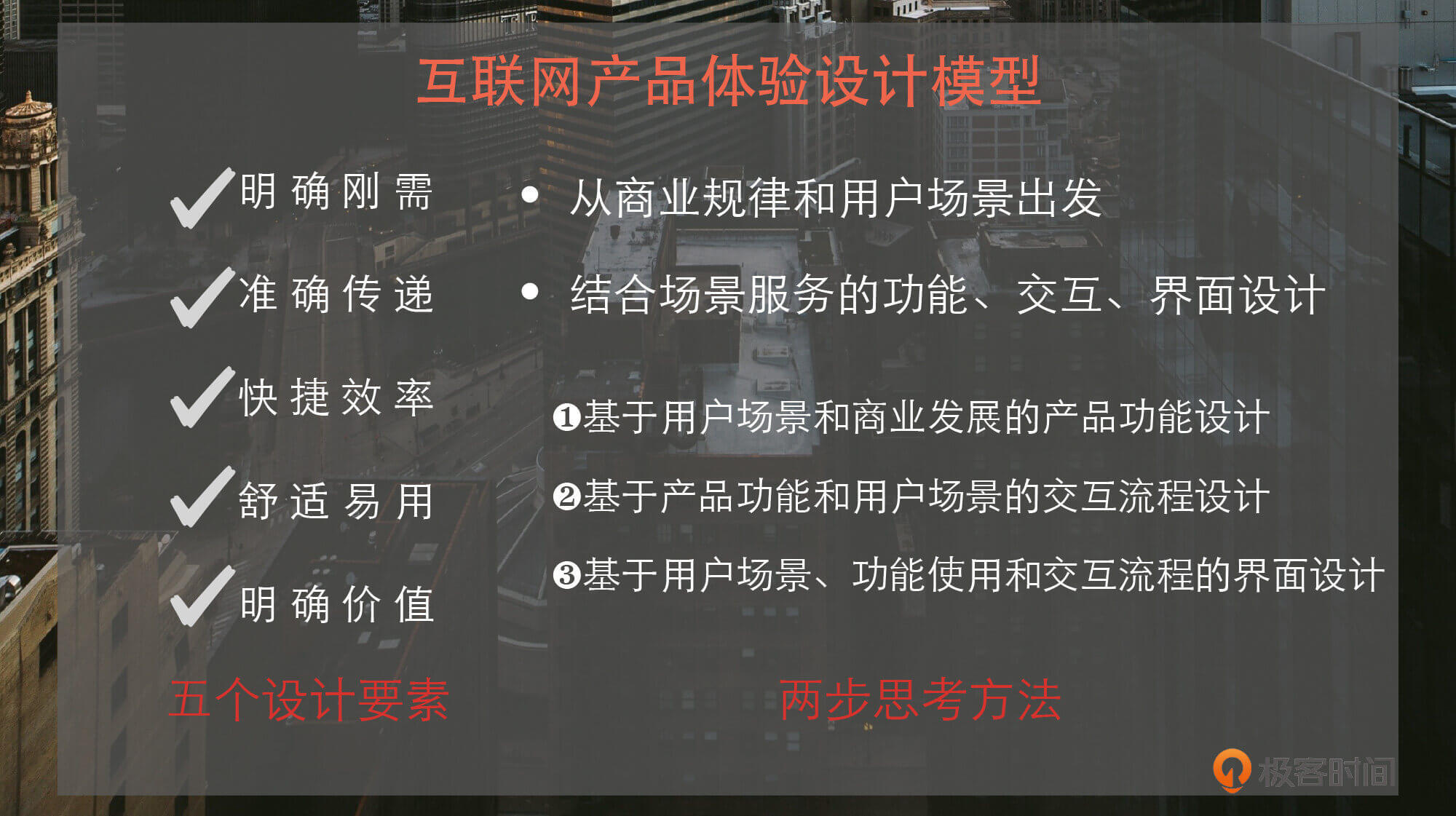 - 我们要了解互联网产品体验设计的两步关键思考方法:商业规律和用户场景、功能设计和交互界面。