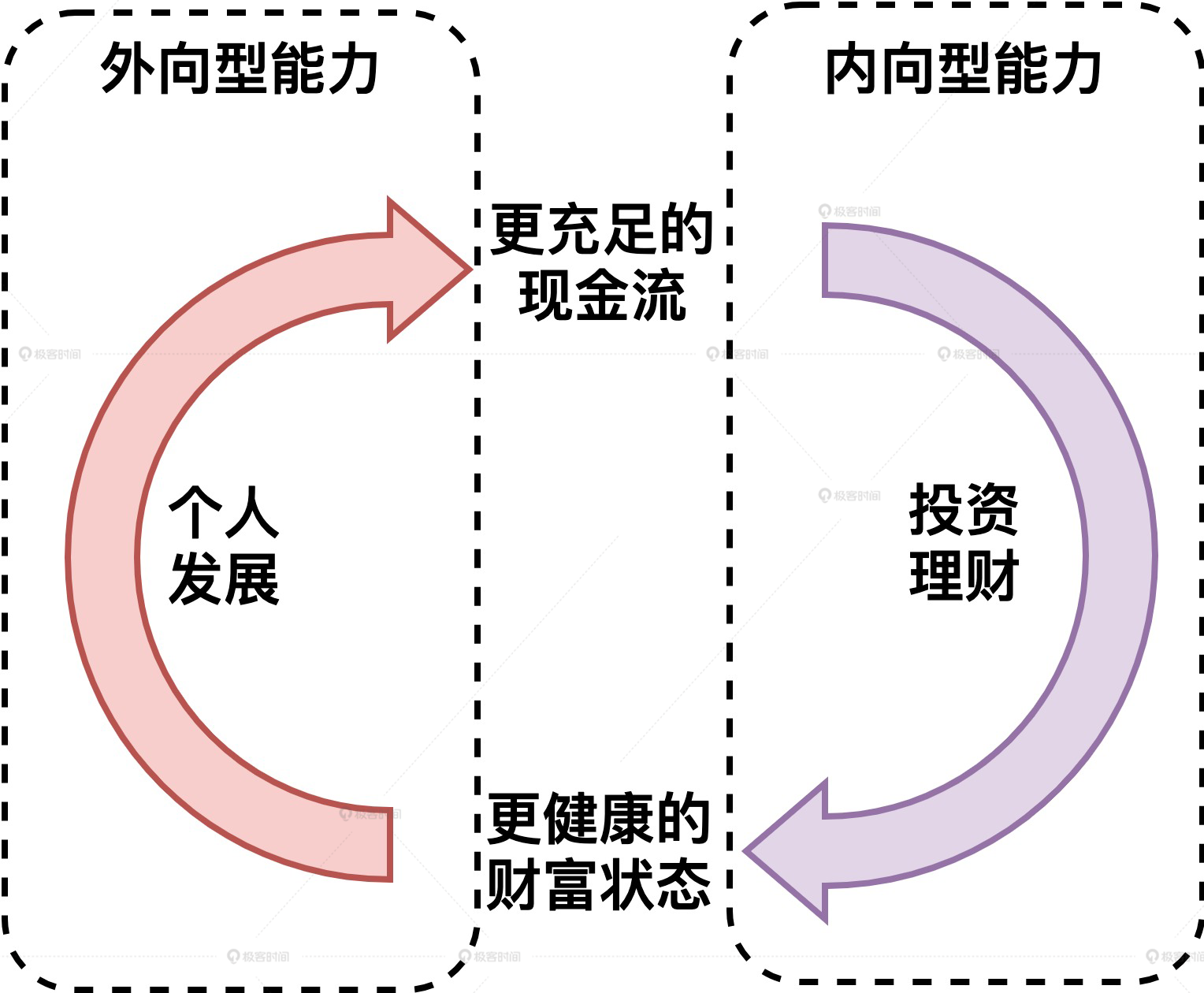 个人发展需要外向型能力,投资理财需要内向型能力,所以从能力范畴上讲,个人发展和投资理财是完美互补的。而从财富管理的角度来说,它们又是互相支撑,互相加速的。我把这个过程称为“财富飞轮”。