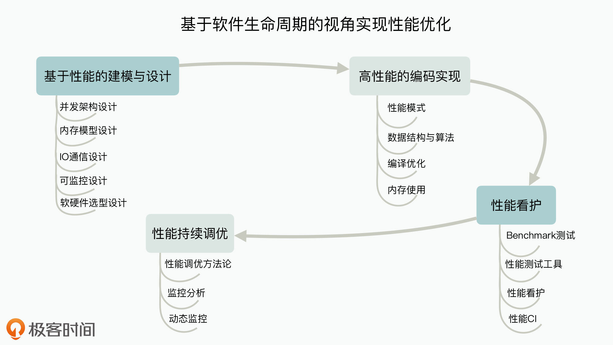 而在这门课程中,我要给你介绍的性能优化,是从整个软件生命周期的视角去关注与审视软件性能,通过主动式地设计与实现来主导软件性能,从而支撑软件性能长期保持竞争力。