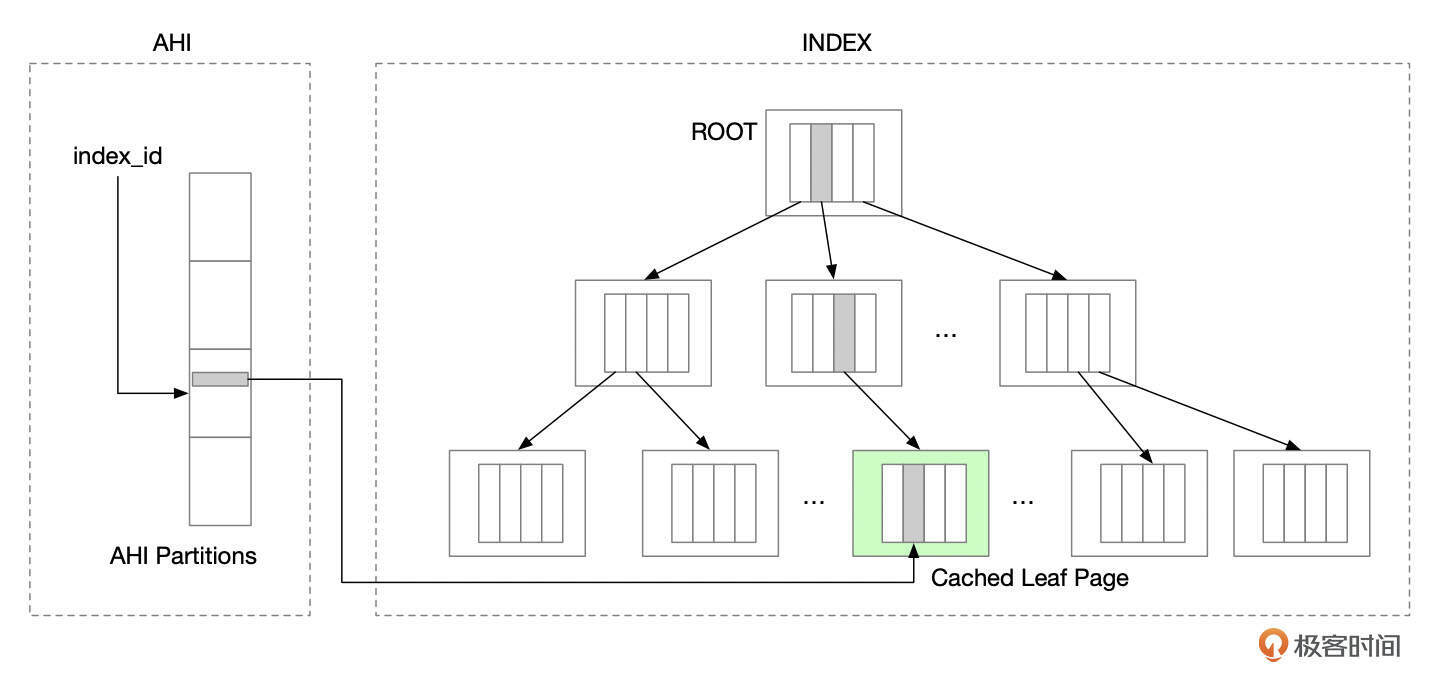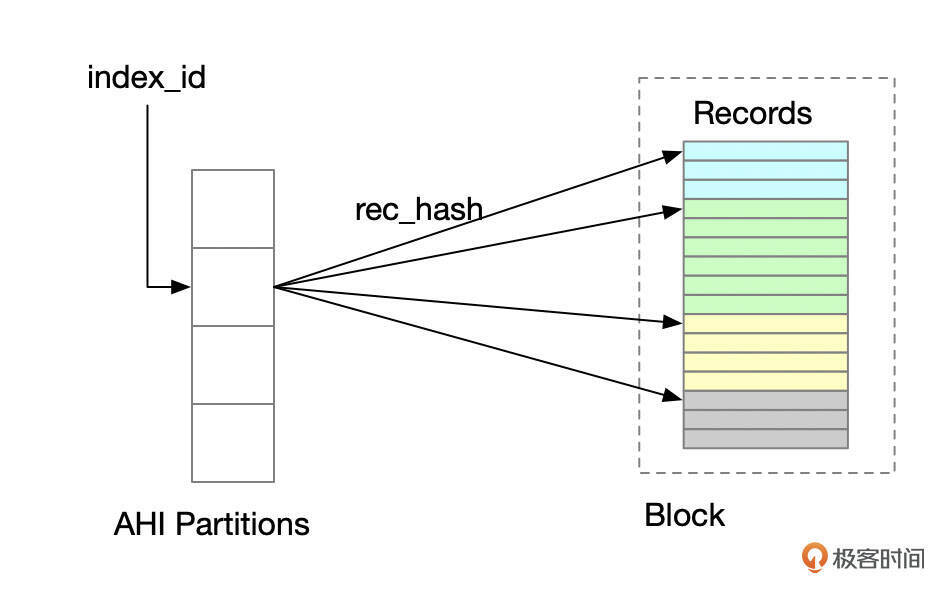下面是AHI的一个示意图,AHI中,Key是索引记录或索引记录的前缀,Value指向索引叶子页面中的索引条目。