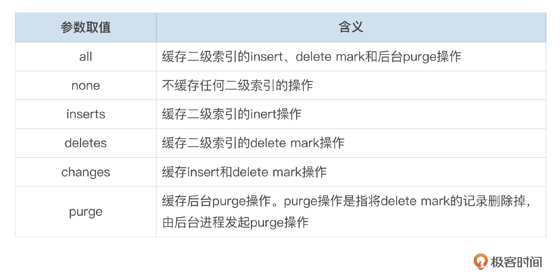 参数innodb_change_buffer_max_size控制change buffer允许使用的最大内存,默认为innodb buffer pool大小的25%。参数innodb_change_buffering用于控制将哪些操作缓存到change buffer中,参数可设置的值请参考下面这个表格。