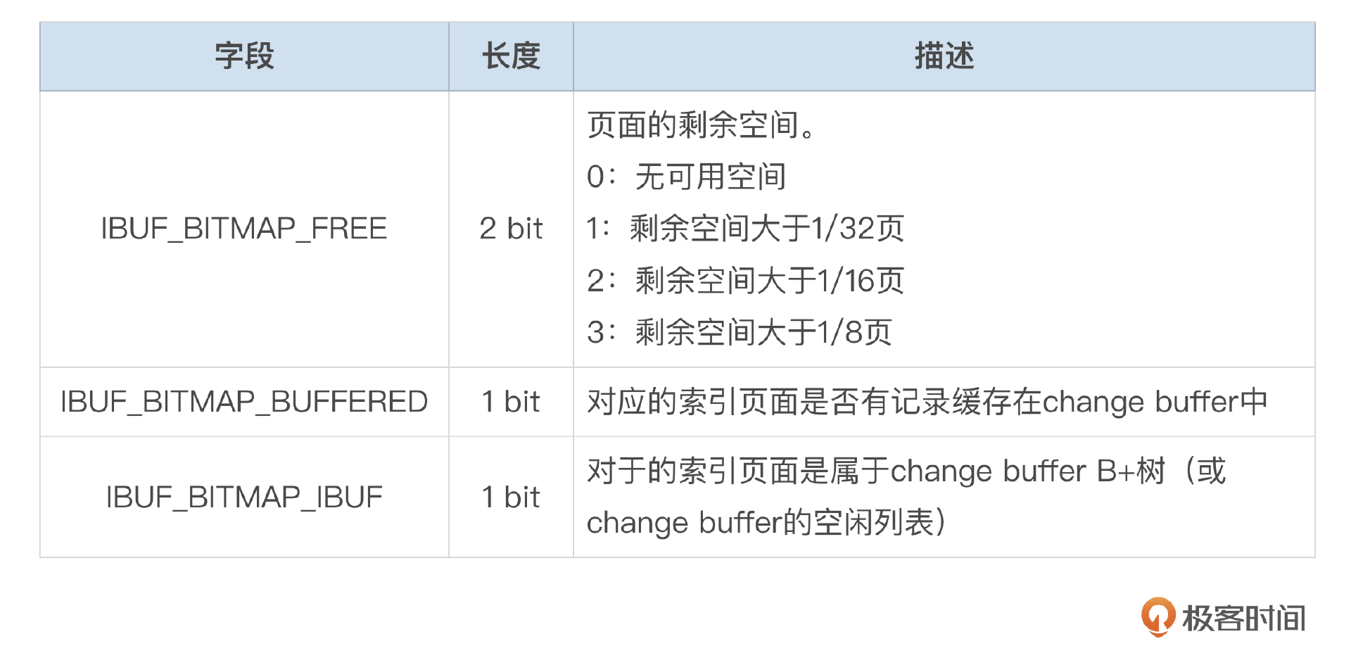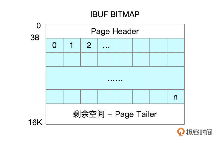 Change Buffer位图信息中,记录了每个索引页面的剩余空间信息。位图页和数据页存储在相同的表空间中。数据文件中,每256M连续空间中的第二个页面用来存储位图信息。