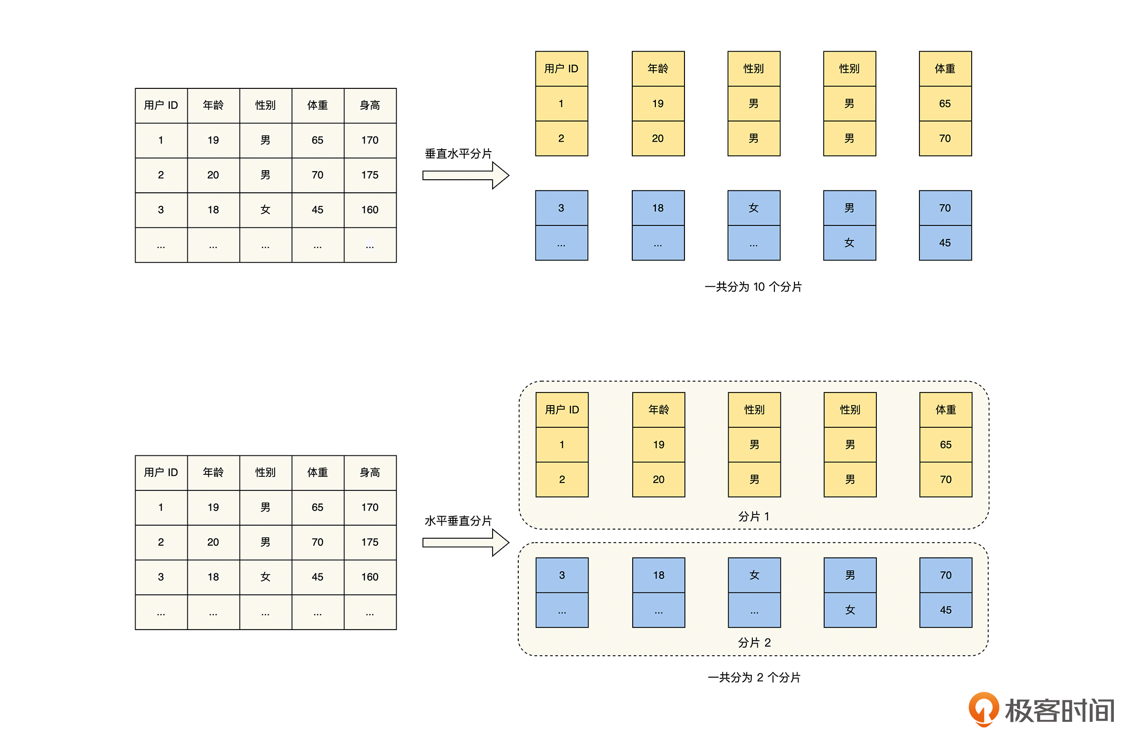 根据这两种策略的组合顺序,可以将它们分为垂直水平分片策略和水平垂直分片策略。前者先进行垂直分片,再进行水平分片,而后者先进行水平分片,然后再进行垂直分片,具体方法如下图所示。