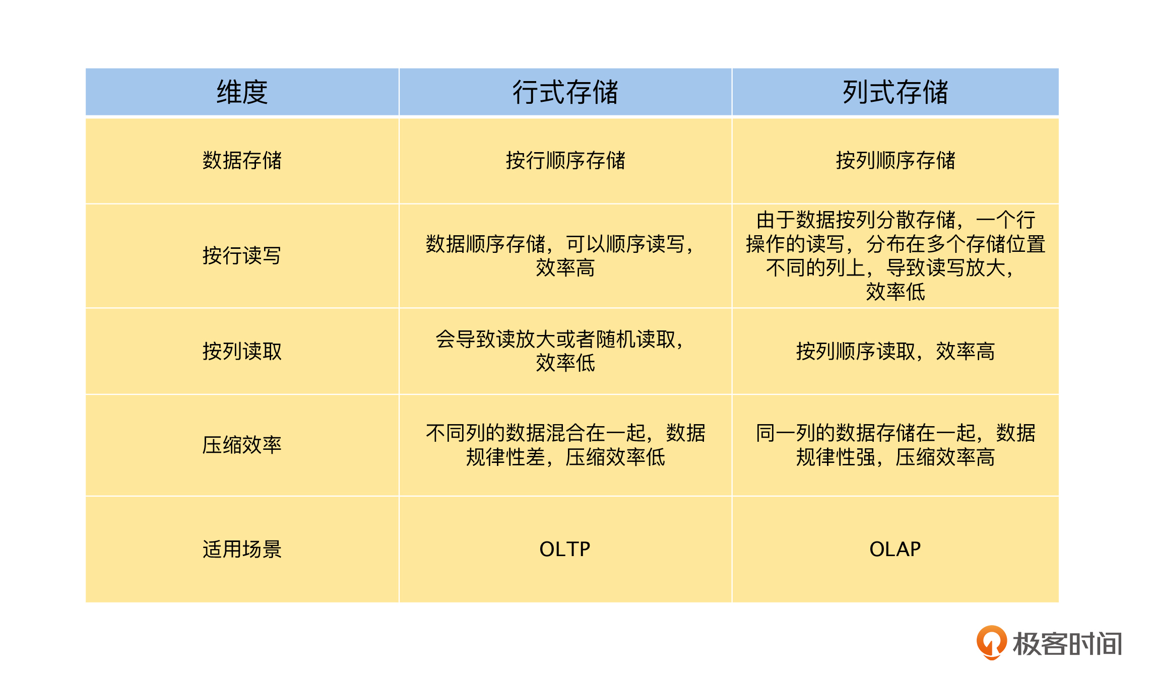 然后,我们对行式存储和列式存储,进行了全面的对比和总结,这样你就进一步地理解了行式存储和列式存储的优缺点以及适用场景。同时,它也是一个非常有价值的结论,一个非常方便的知识库,在有需要的时候,你也可以直接查看。