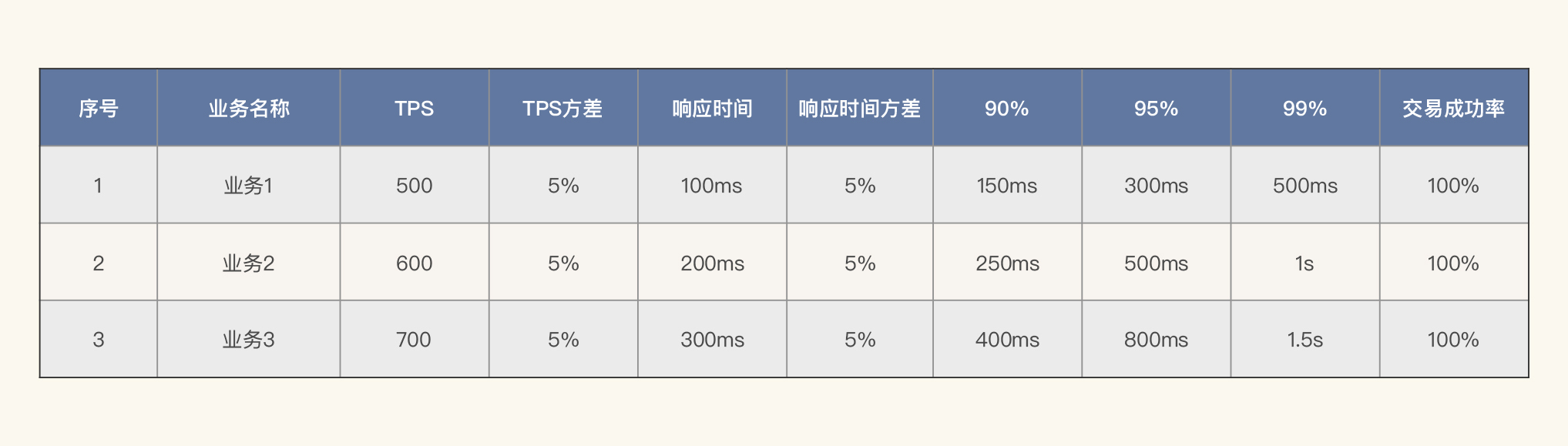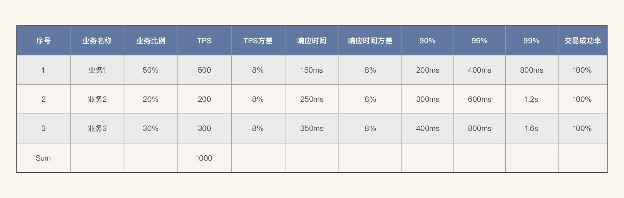 我们先说下业务需求指标。我们可以列这样一个单业务性能指标的表格。