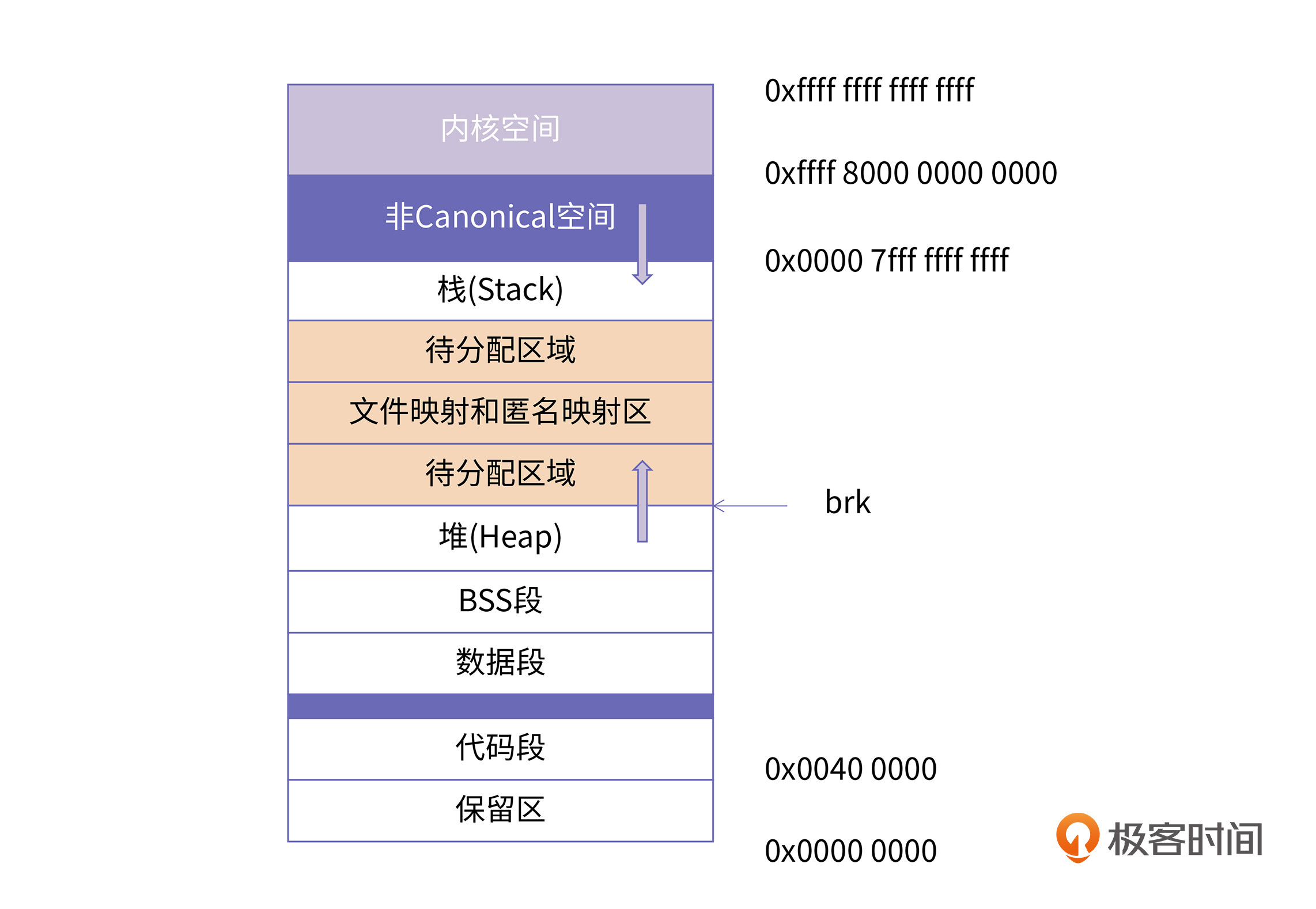 在接下来的课程中,我会给你详细介绍内存布局中的堆跟栈,这两块也是我们开发人员最常打交道的内存区域,让你对程序运行时的环境和内存状态有一个更深入的理解。
