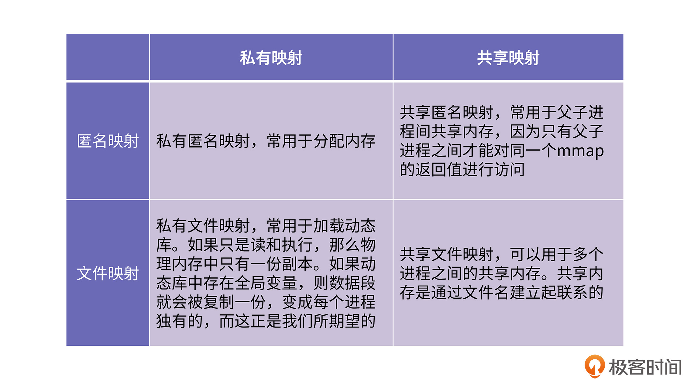 通常,我们使用私有匿名映射来进行堆内存的分配,具体的原理我们会在第9节课详细分析。