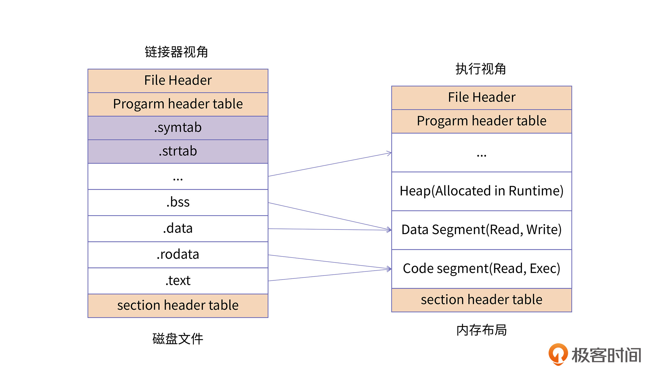 上图从两个视角展示了应用程序的分布,左边是程序在磁盘中的文件布局结构,右边是程序加载到内存中的内存布局结构。