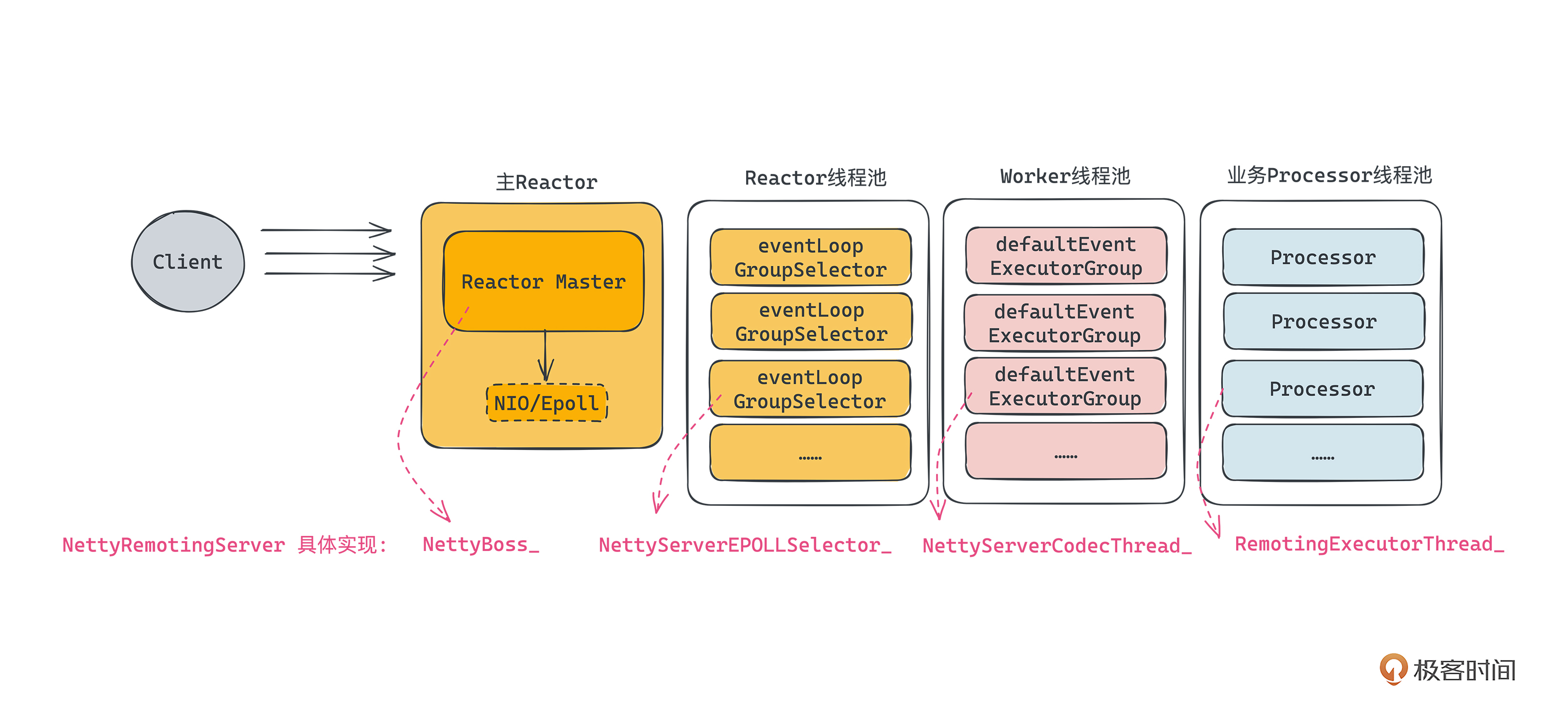 当前业界消息队列的网络模型,比如Pulsar、Kafka、RocketMQ,为了保证性能,都是基于主从 Reactor 多线程模型开发的。