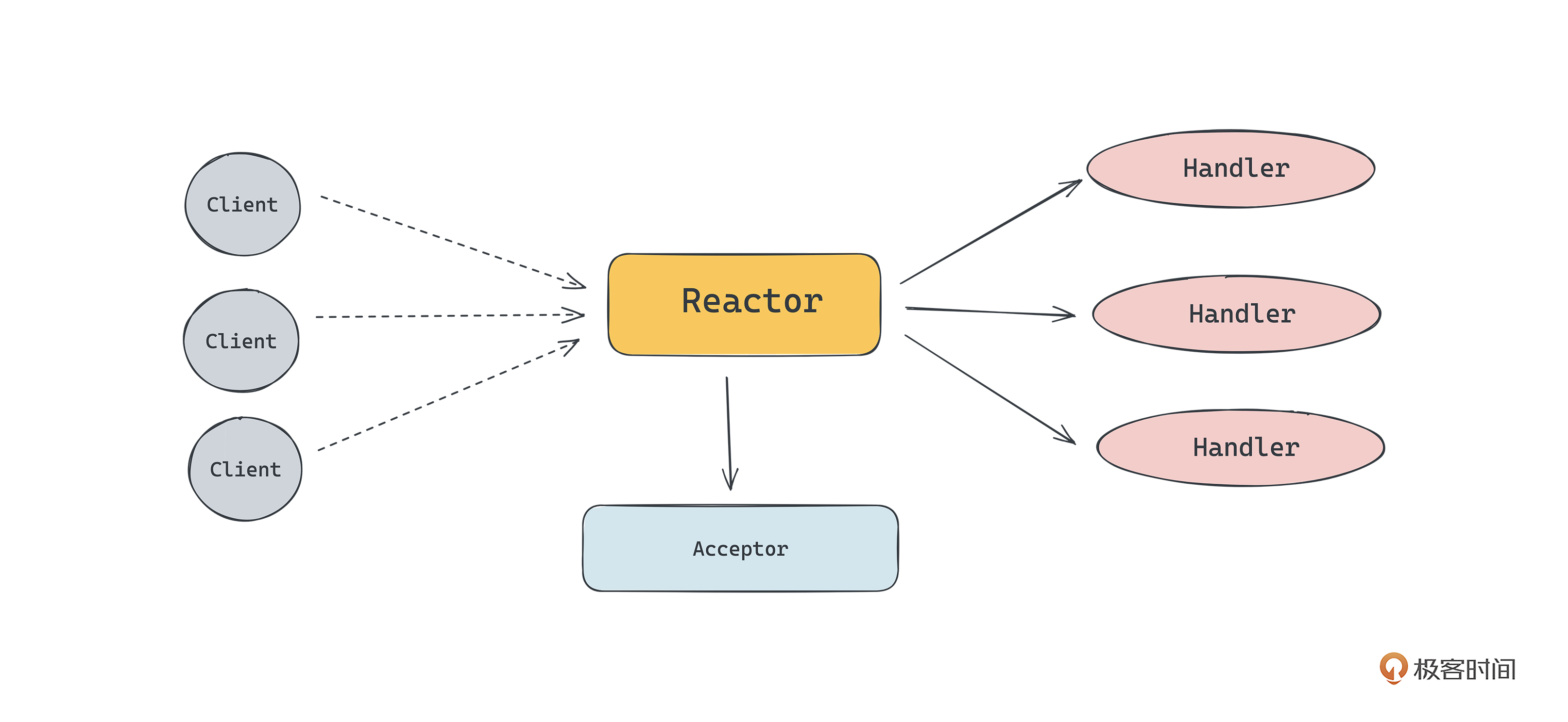 Reactor 模型是一种处理并发服务请求的事件设计模式,当主流程收到请求后,通过多路分离处理的方式,把请求分发给相应的请求处理器处理。如下图所示,Reactor 模式包含Reactor、Acceptor、Handler三个角色。