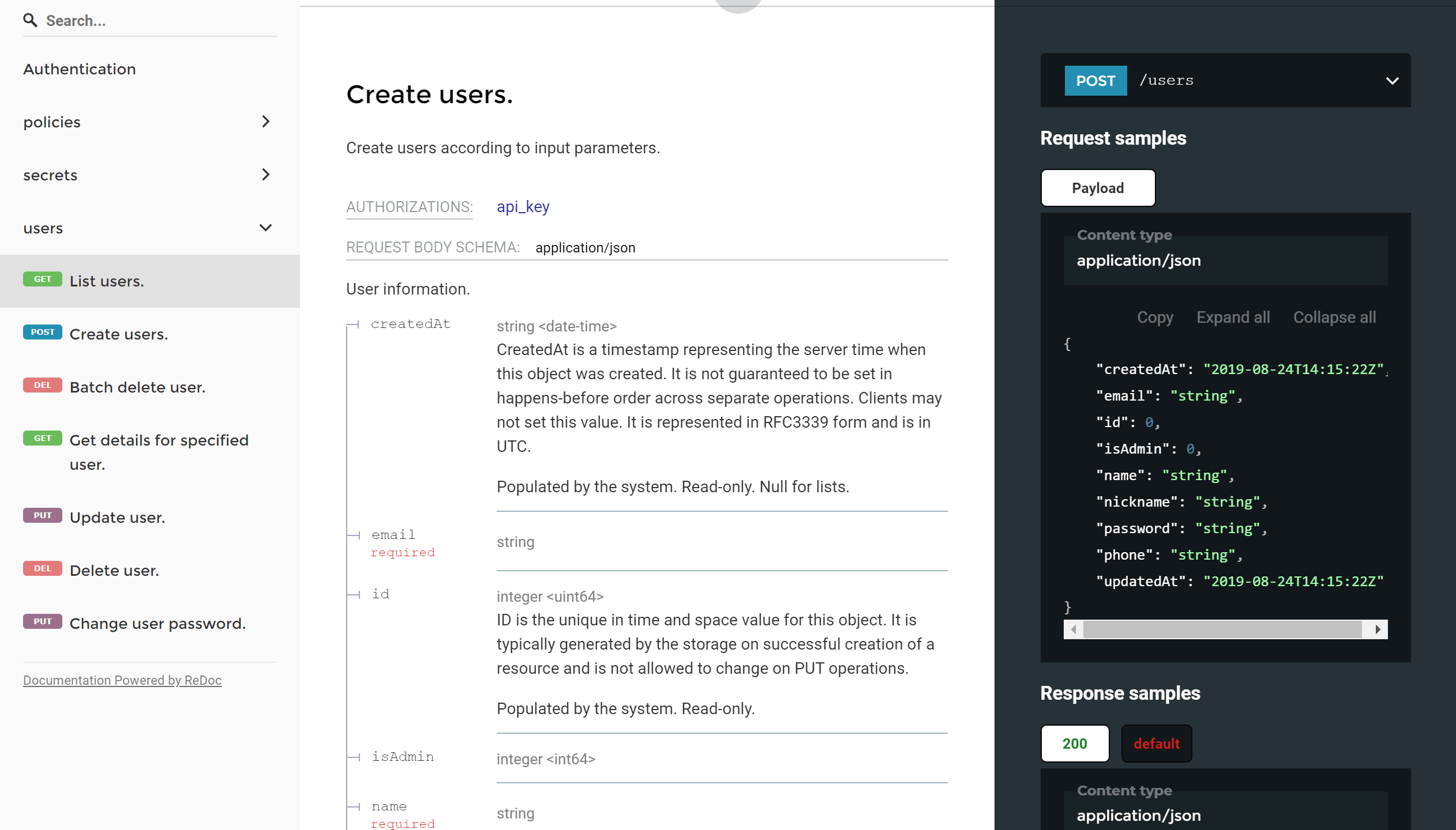 - 每个API上可用的路径(/users)和操作(GET /users,POST /users)。