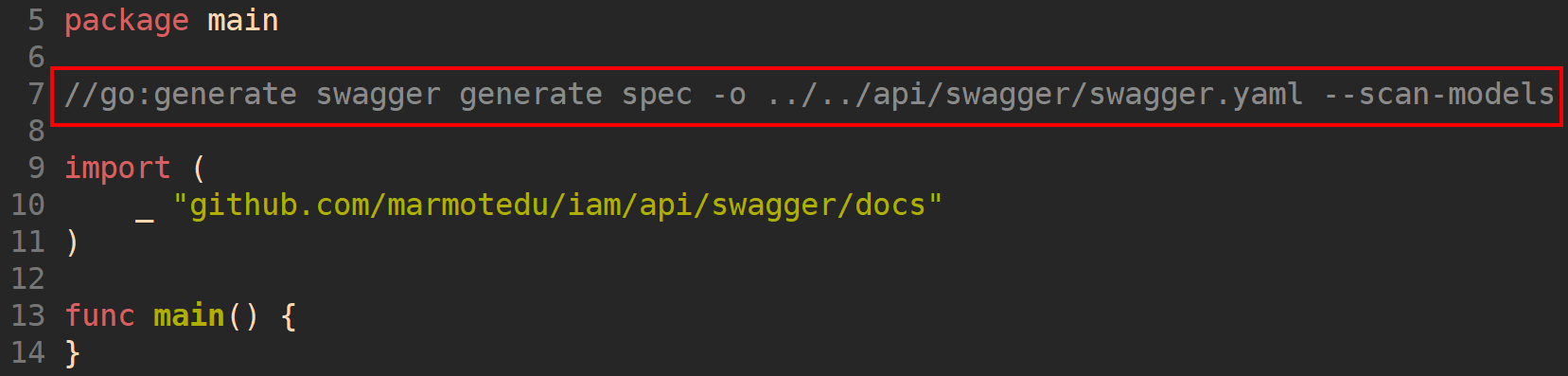 IAM的Swagger文档,还可以通过在iam源码根目录下执行go generate ./...命令生成,为此,我们需要在iam/cmd/genswaggertypedocs/swagger_type_docs.go文件中,添加//go:generate注释。如下图所示: