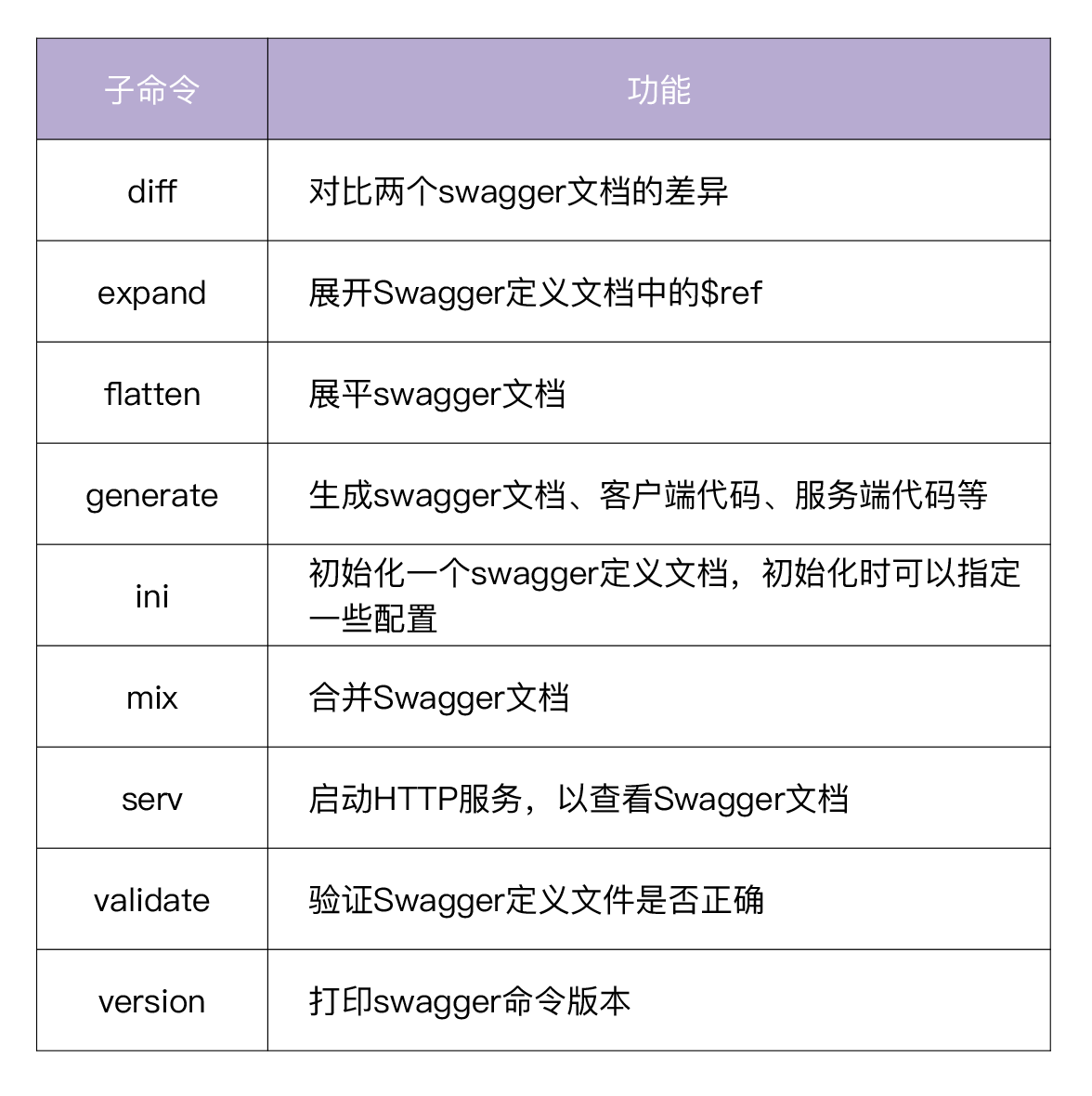 swagger命令格式为swagger [OPTIONS] <command>。可以通过swagger -h查看swagger使用帮助。swagger提供的子命令及功能见下表: