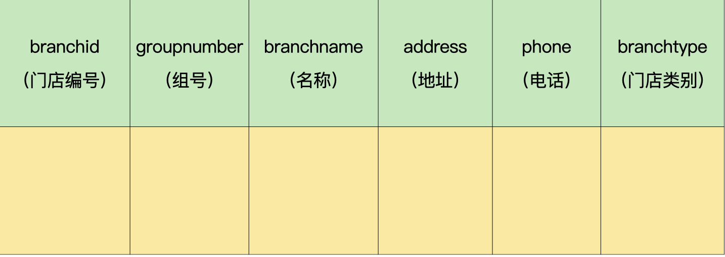 - 员工:组号、门店编号、工号、名称、身份证、电话、职责。