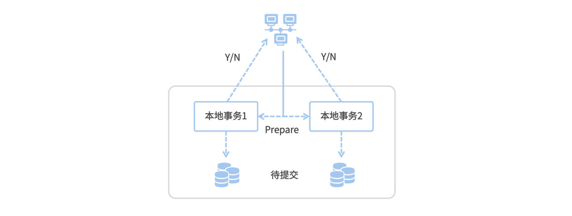 第一步(Prepare):Coordinator向各个分布式事务的参与者下达了Prepare指令,各个事务分别将SQL语句在数据库执行但不提交,并且将就绪状态上报给Coordinator。