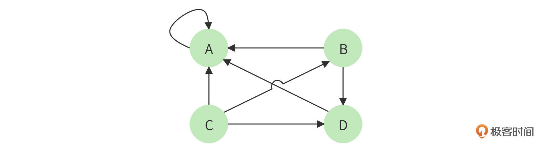 以下面四个网页A、B、C、D举例,带箭头的线条表示链接。
