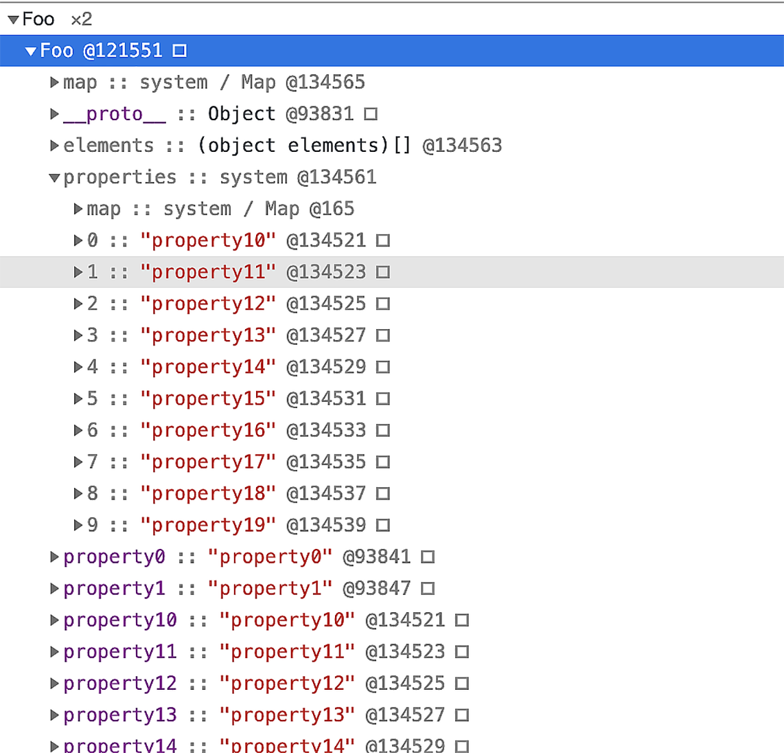 由于创建的常用属性超过了10个,所以另外10个常用属性就被保存到properties中了,注意因为properties中只有10个属性,所以依然是线性的数据结构,我们可以看其都是按照创建时的顺序来排列的。