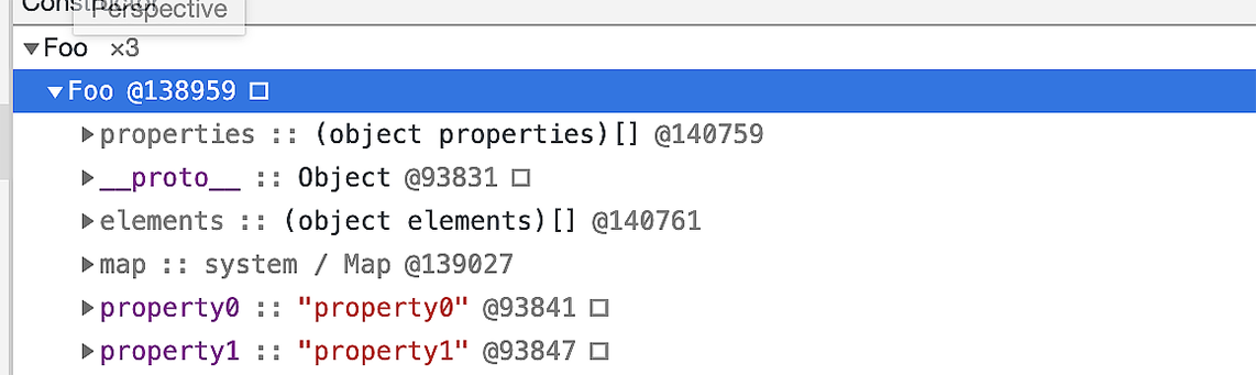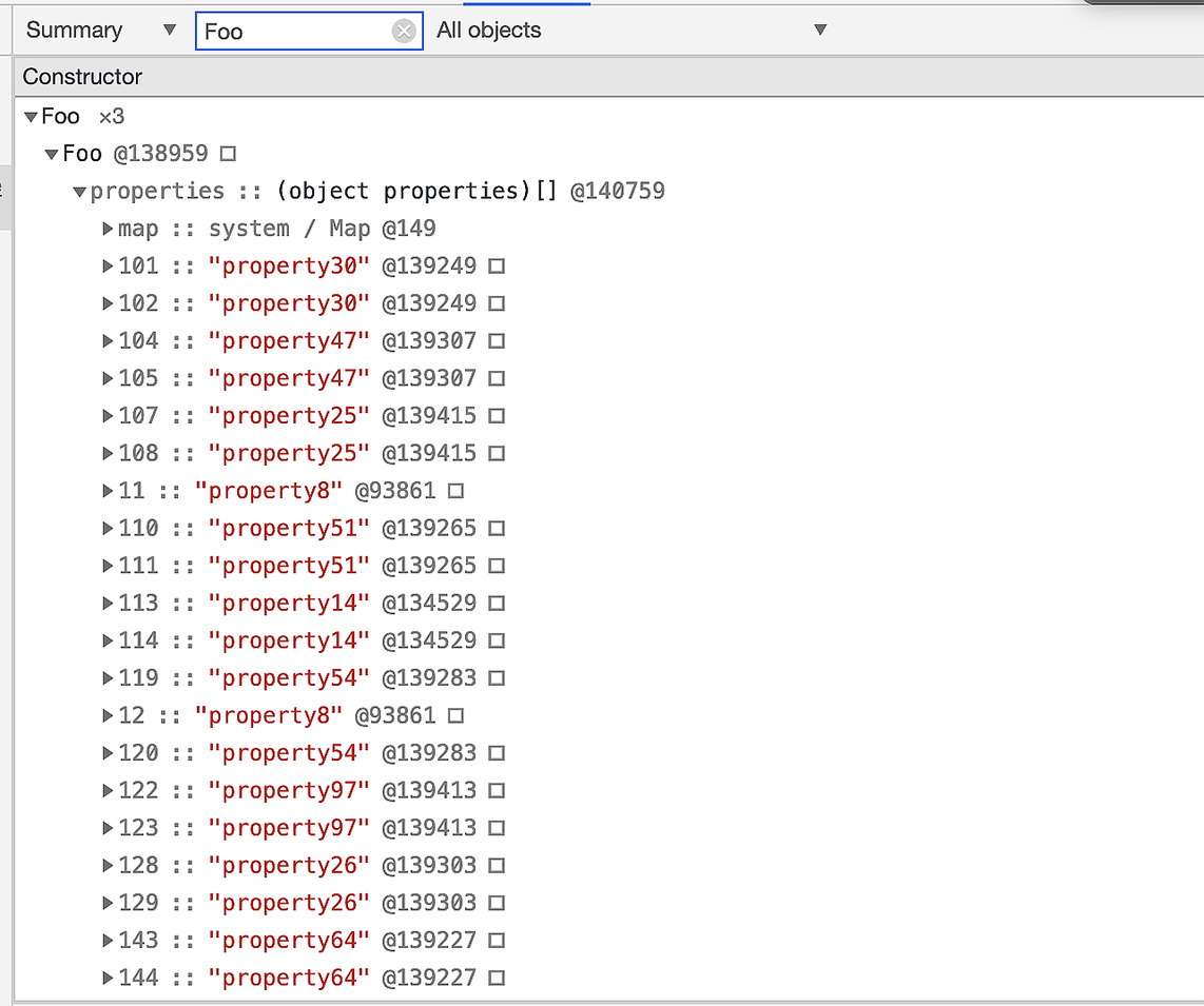 观察上图,我们搜索出来了所有经过构造函数Foo创建的对象,点开Foo的那个下拉列表,第一个就是刚才创建的bar对象,我们可以看到bar对象有一个elements属性,这里面就包含我们创造的所有的排序属性,那么怎么没有常规属性对象呢?