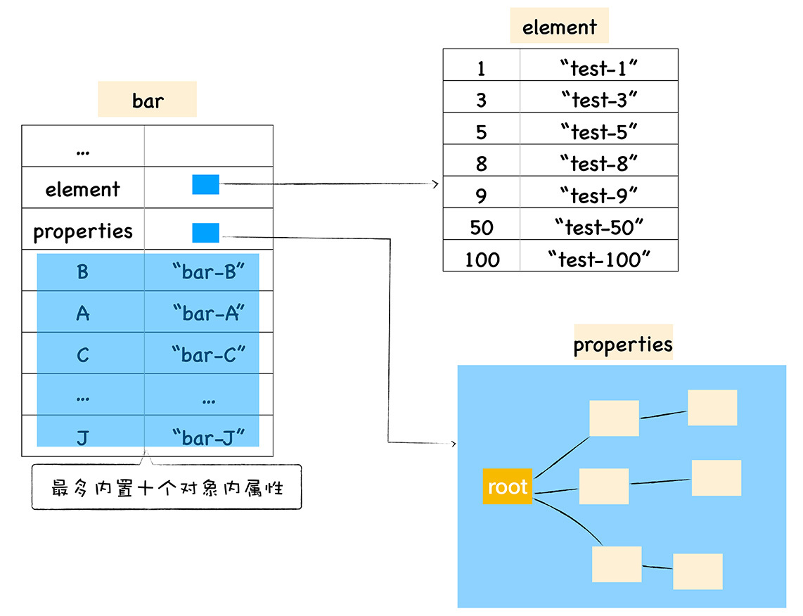 这是因为只创建了10个常规属性,所以V8将这些常规属性直接做成了bar对象的对象内属性。