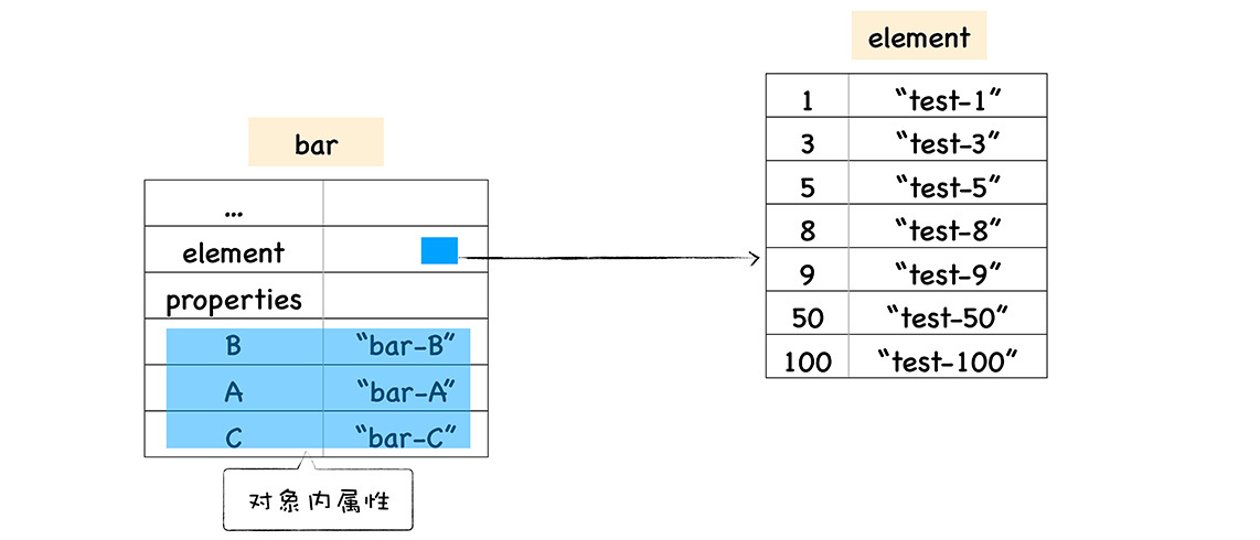 通过上图我们可以发现,bar对象包含了两个隐藏属性:elements属性和properties属性,elements属性指向了elements对象,在elements对象中,会按照顺序存放排序属性,properties属性则指向了properties对象,在properties对象中,会按照创建时的顺序保存了常规属性。