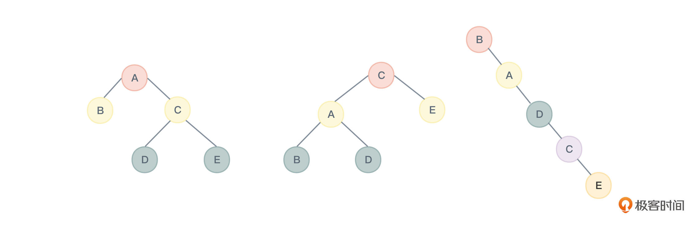 其次,已知前序遍历,同样无法唯一确定一棵二叉树。如图7所示的几棵二叉树,他们的节点数据内容不同,但进行前序遍历得到的序列都是BADCE: