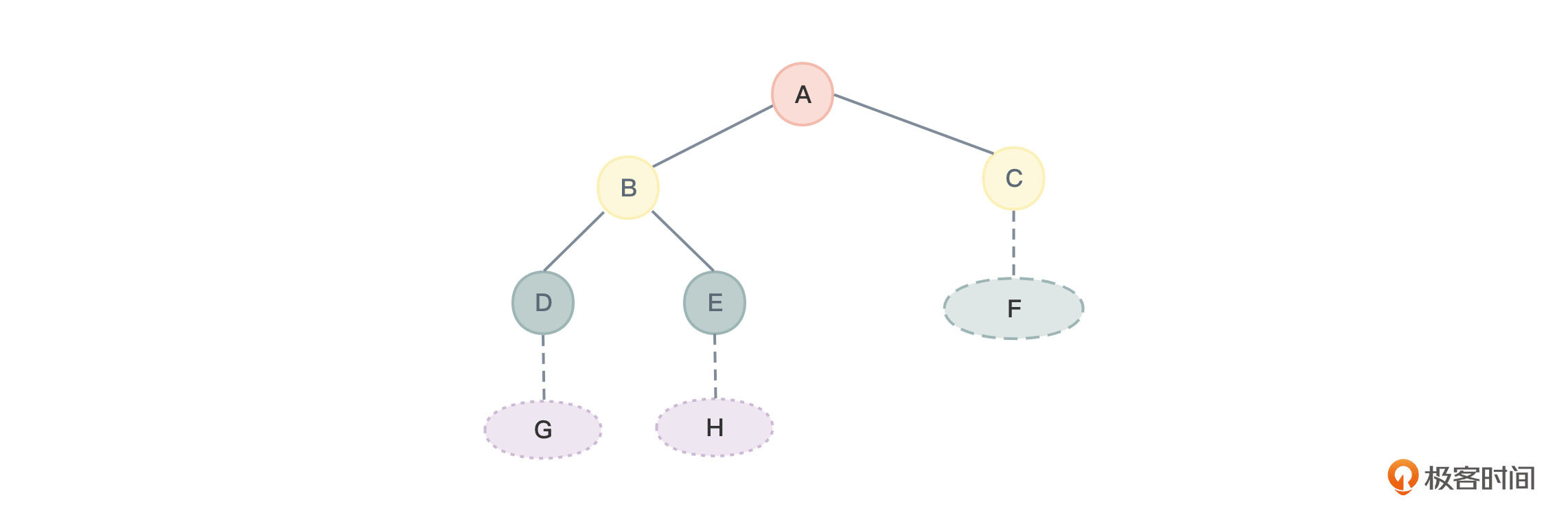 - 看看中序遍历序列是“DGBHEACF”,G在D后面,H在E的前面,F在C的后面,根据中序遍历的左根右规则,G是D的右孩子, H是E的左孩子,F是C的右孩子。这样,完整的二叉树就确定下来了,如前面图15所示。