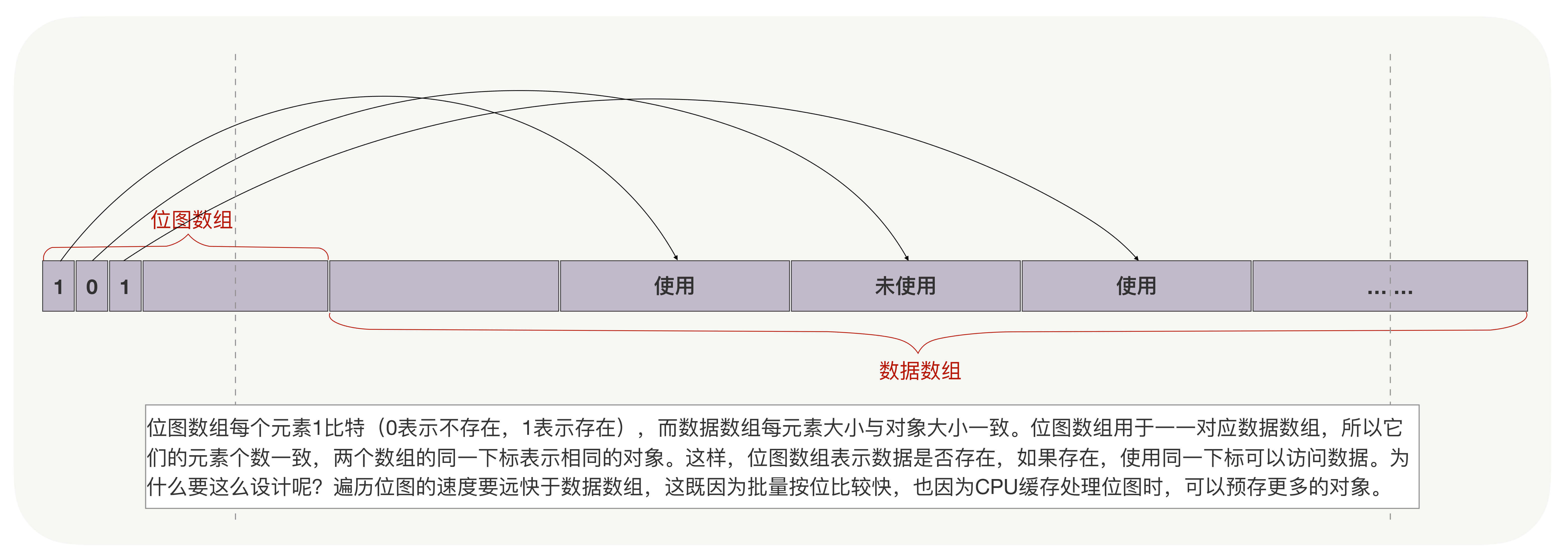 位图常用于解决缓存穿透的问题,也常用于查找数组中的可用对象,比如下图中通过批量判断位图数组的比特位(对CPU缓存也很友好),找到数据数组中的对应元素。