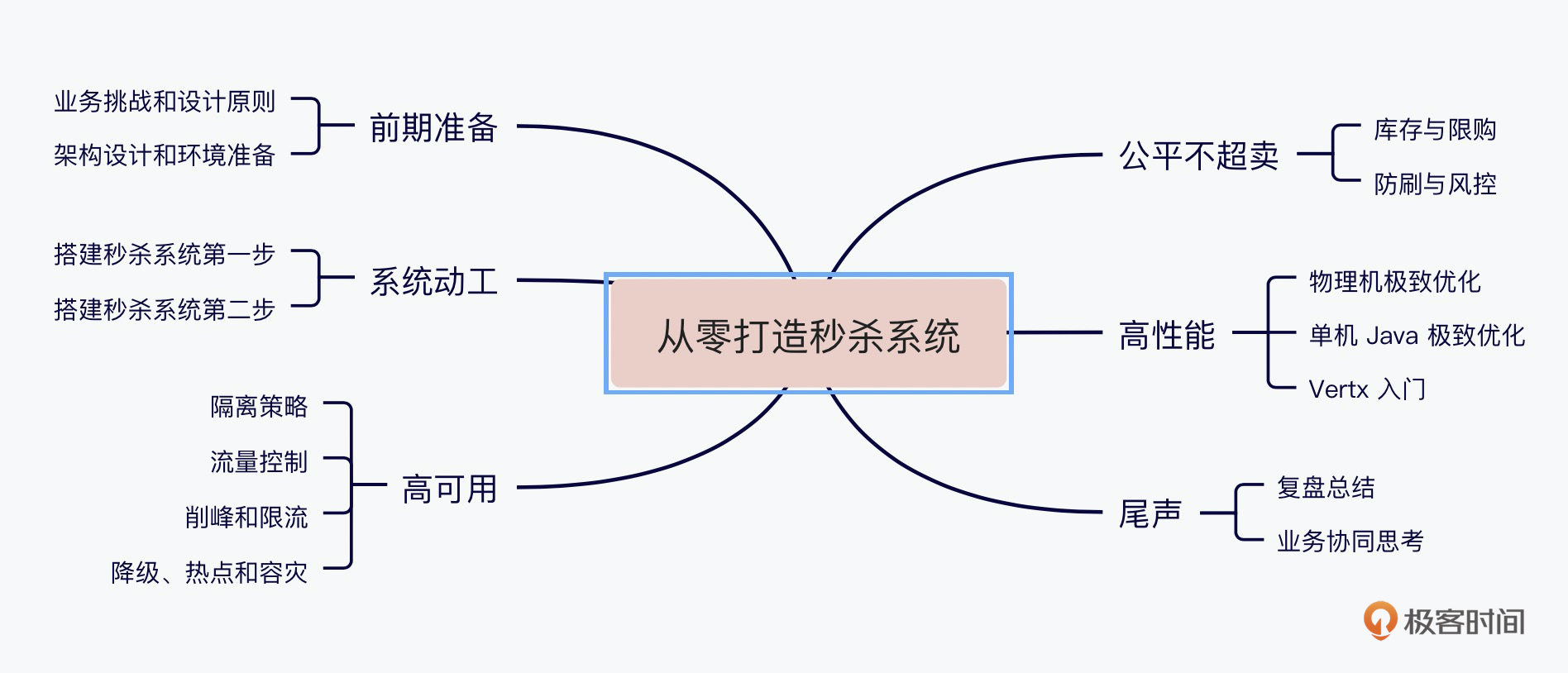 讨论完这几个问题,你是不是已经开始好奇这门秒杀课会有什么不一样的地方?毕竟电商发展到今天,秒杀系统已经不是个新鲜的话题了。那么闲话少叙,我们一起看看课程设计。