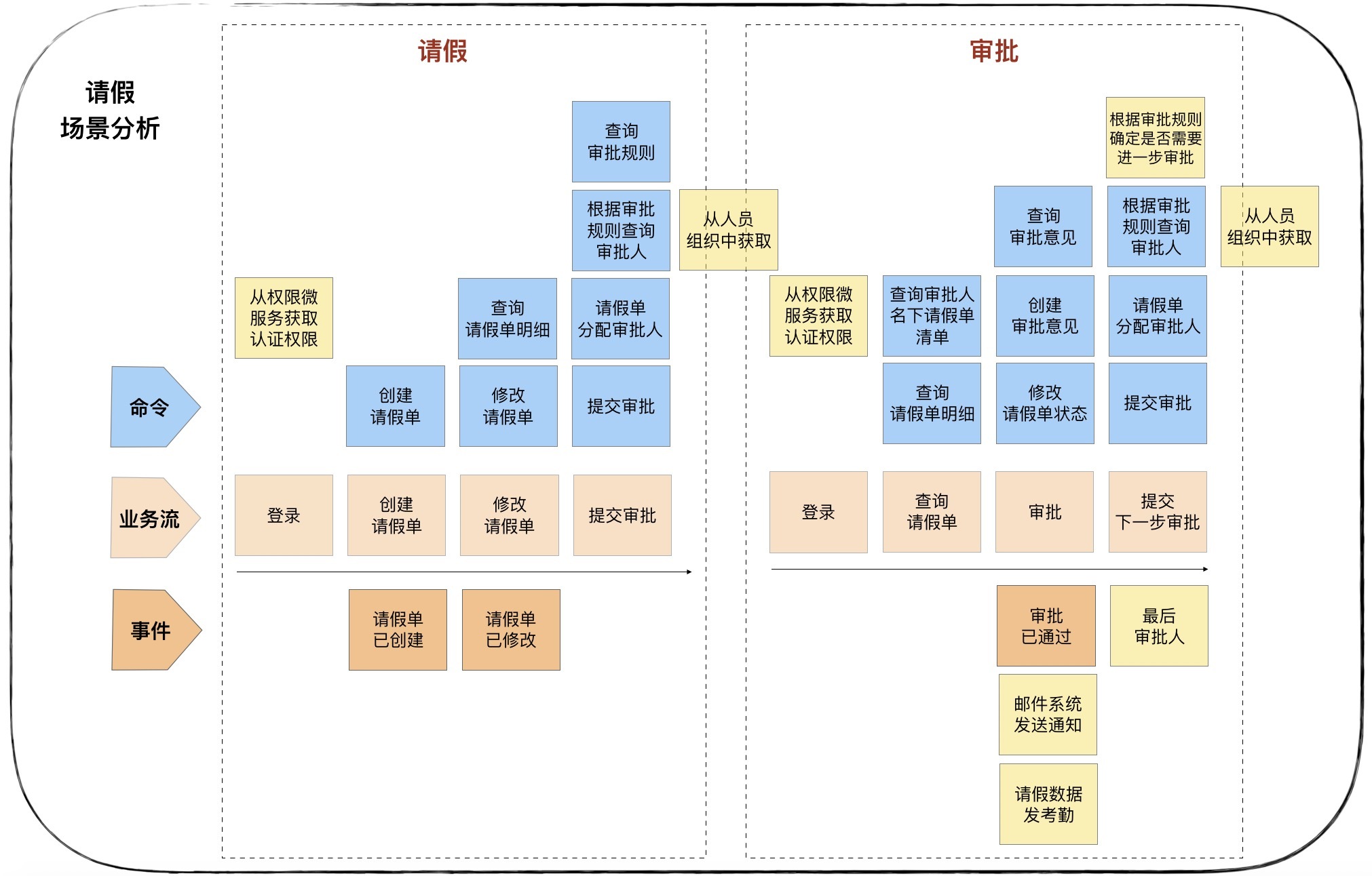 项目团队成员一起用事件风暴分析请假和考勤的用户旅程。根据不同角色的旅程和场景分析,尽可能全面地梳理从前端操作到后端业务逻辑发生的所有操作、命令、领域事件以及外部依赖关系等信息。