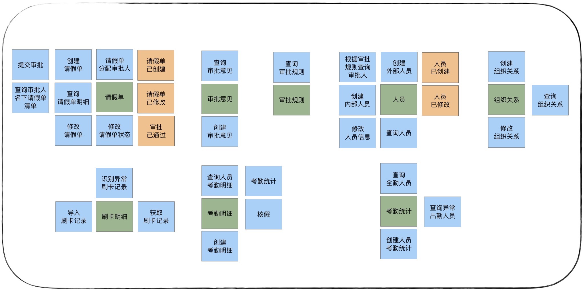 经过分析,我们建立了请假、人员组织关系和考勤三个聚合。其中请假聚合有请假单、审批意见实体和审批规则等值对象。人员组织关系聚合有人员和组织关系等实体。考勤聚合有刷卡明细、考勤明细和考勤统计等实体。