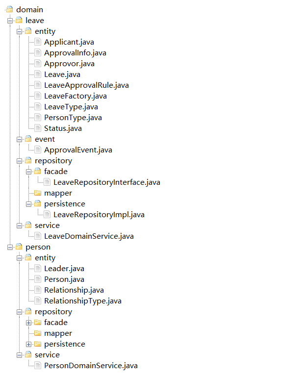 根据DDD的代码模型和各领域对象所在的包、类和方法,我们可以定义出请假微服务的代码结构,设计代码对象。