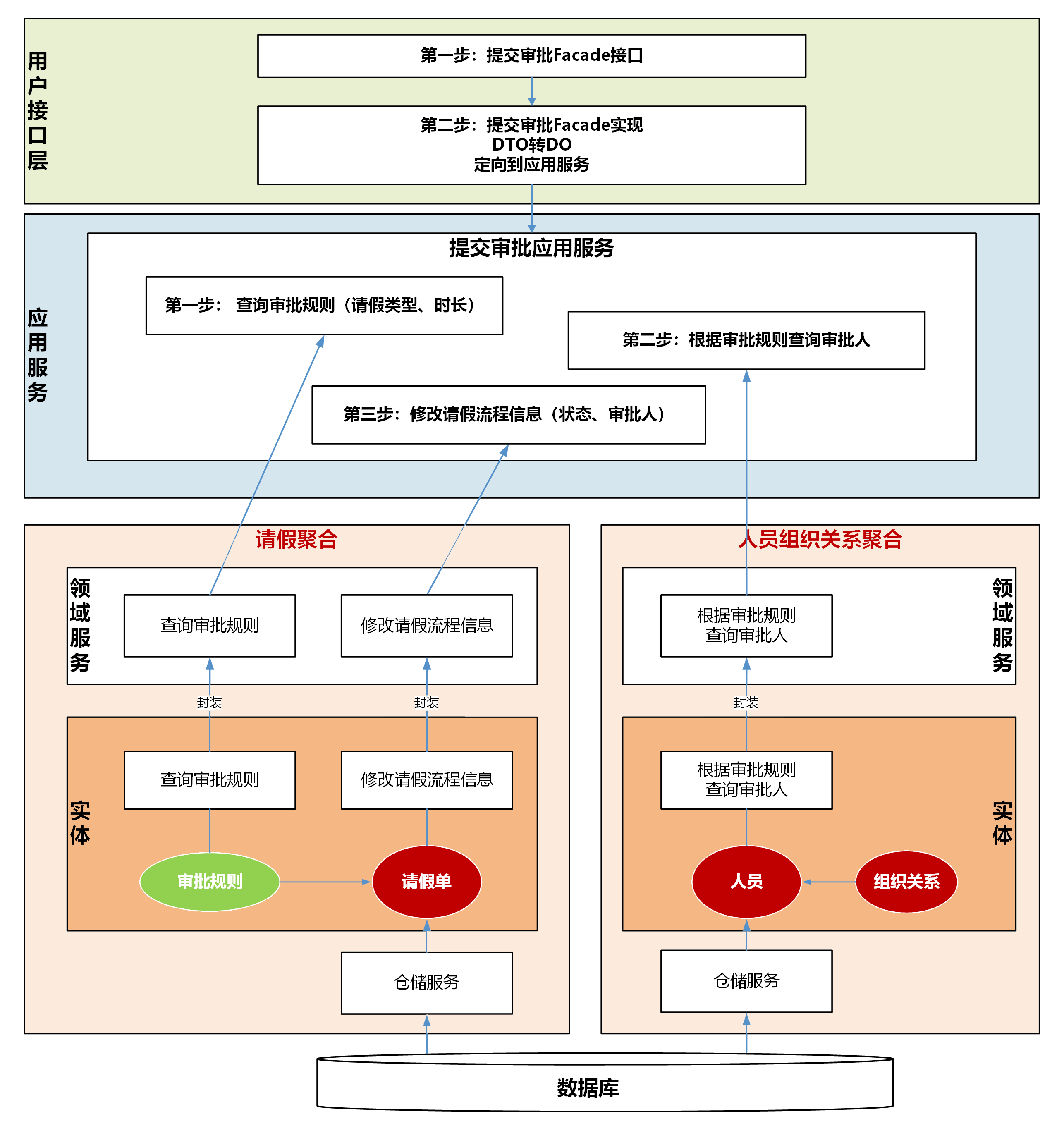 请假微服务领域层包含请假和人员两个聚合。人员和请假代码都放在各自的聚合所在目录结构的代码包中。如果随着业务发展,人员相关功能需要从请假微服务中拆分出来,我们只需将人员聚合代码包稍加改造,独立部署,即可快速发布为人员微服务。到这里,微服务内的领域对象,分层以及依赖关系就梳理清晰了。微服务的总体架构和代码模型也基本搭建完成了。