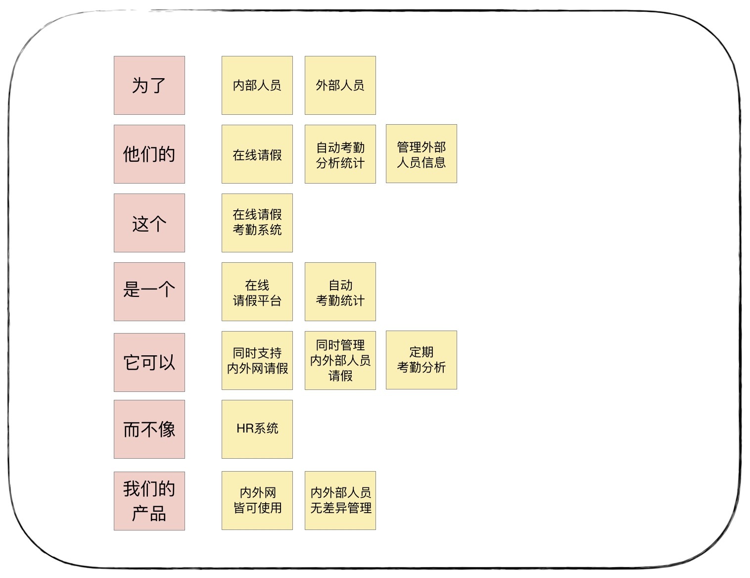 **我们把这个产品愿景图整理成一段文字就是:**为了满足内外部人员,他们的在线请假、自动考勤统计和外部人员管理的需求,我们建设这个在线请假考勤系统,它是一个在线请假平台,可以自动考勤统计。它可以同时支持内外网请假,同时管理内外部人员请假和定期考勤分析,而不像HR系统,只管理内部人员,且只能内网使用。我们的产品内外网皆可使用,可实现内外部人员无差异管理。