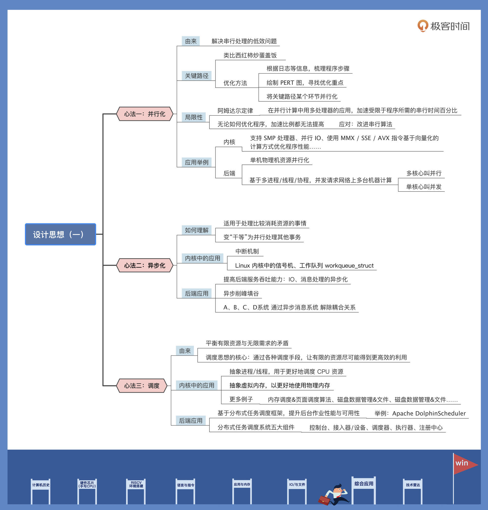 今天,我们学习了在计算机系统中常用的并行化、异步化和调度这三种通用的设计思想,那么请你思考一下,自己工作、生活中还有哪些场景用到了这些思想呢?