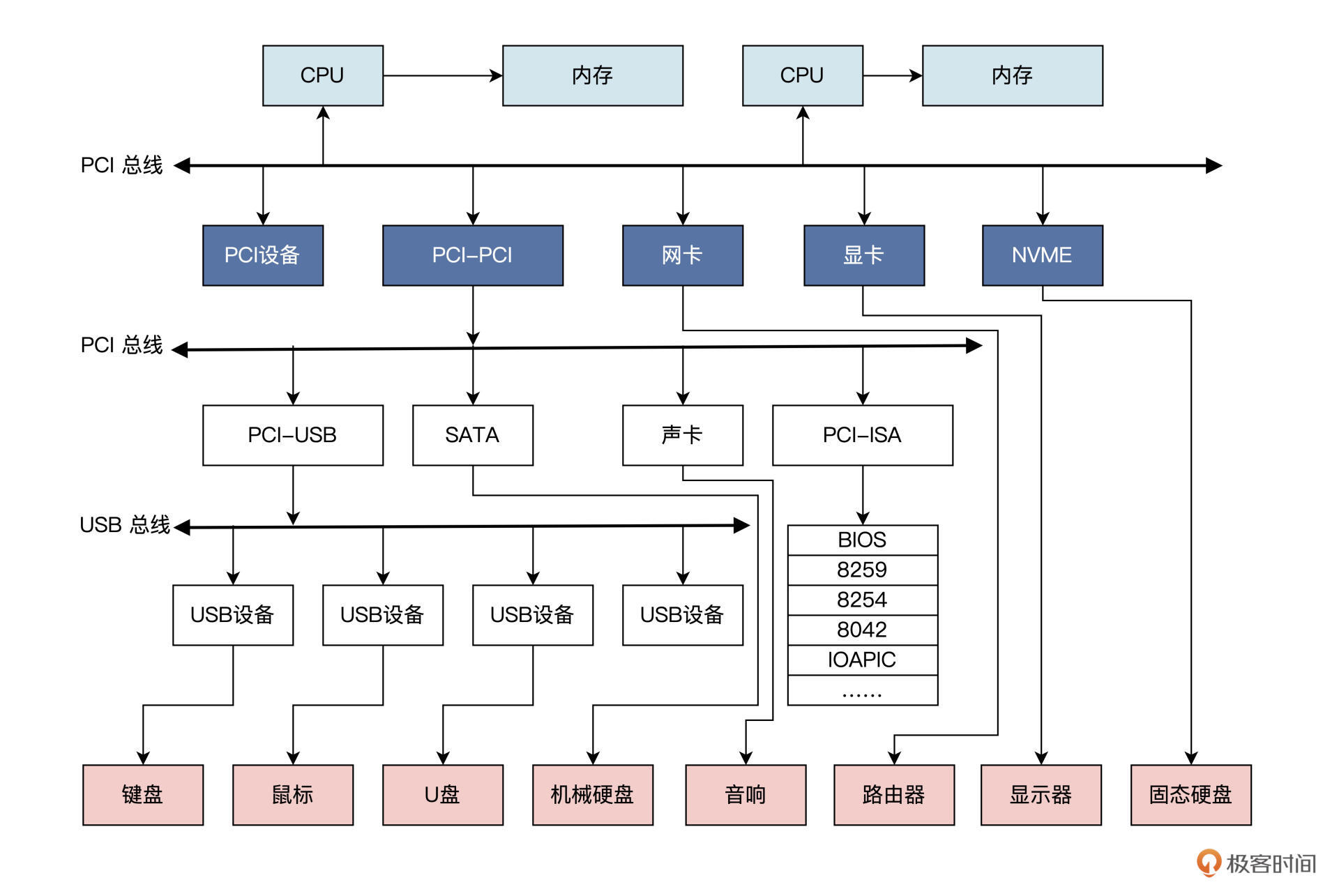 这就是Linux管理多个IO设备的方式,但是Linux驱动模型远比今天课程所介绍的复杂得多,其中还有支持总线和支持设备热拔插的机制。如果你想详细了解Linux驱动模型的实现,可以阅读我的上一季课程《操作系统实战 45 讲》中的第二十八节课到三十一节课。