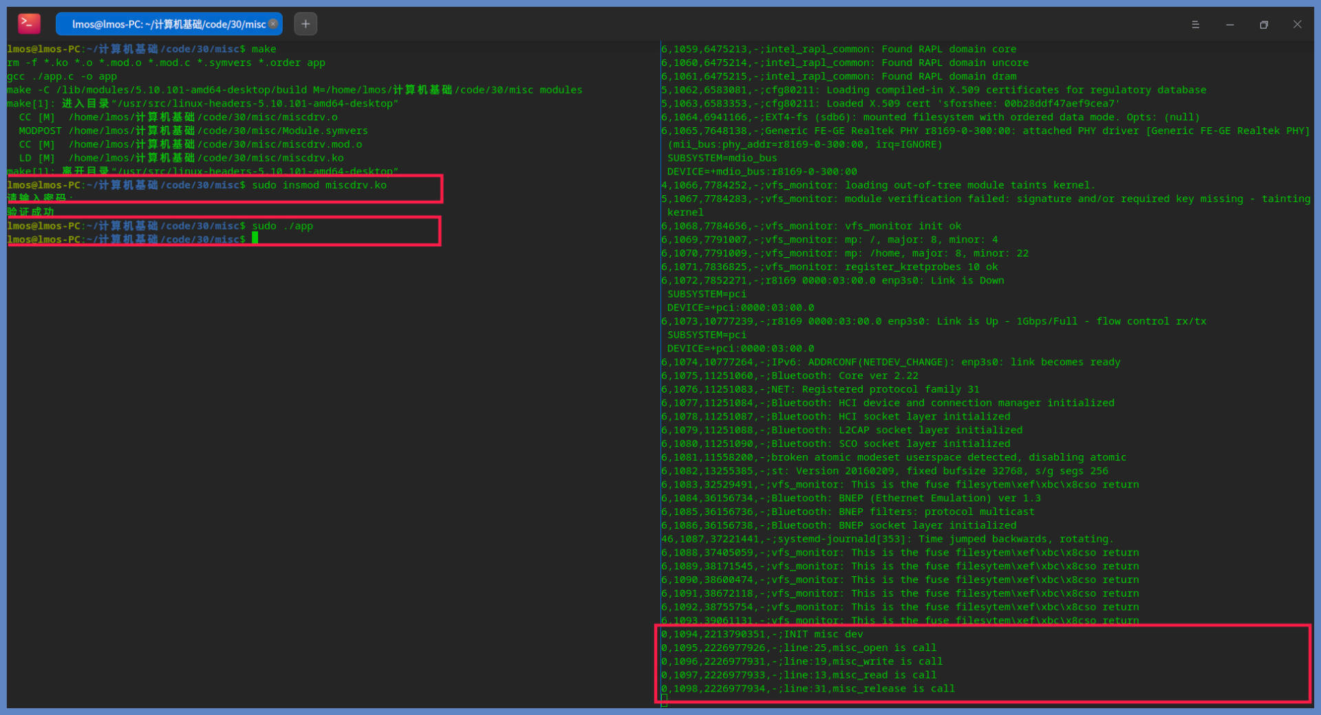 我们在测试之前,先打开一个终端,在其中输入sudo cat /dev/kmsg,以便观察结果。然后再打开一个终端,在其中输入sudo insmod miscdrv.ko,把miscdrv.ko这个Linux内核模块安装加载到系统中。加载好了我们输入sudo app,就可以看结果了,如下图所示:
