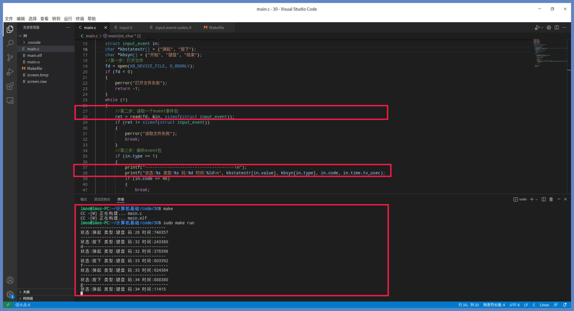 上述代码逻辑很简单,首先打开了/dev/input/event3这个文件,然后在一个循环中反复读取该文件并打印出数据,读取错误和码值等于46时,就跳出循环,最后关闭该文件,程序退出。