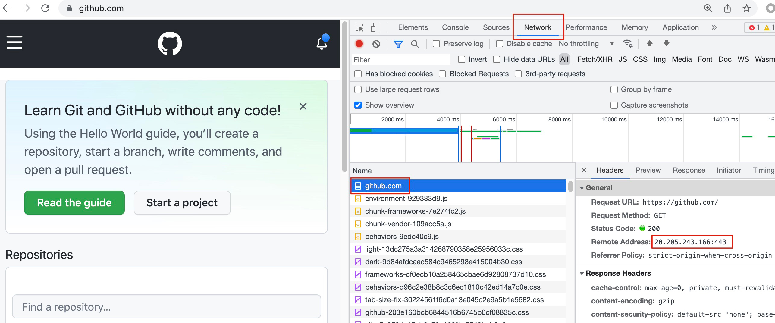访问页面感觉很慢,那么可以借助开发者工具的时间统计功能,找到耗时较高的HTTP资源对象,再针对性排查。比如我觉得访问https://github.com很慢,那么可以先打开开发者工具,然后访问站点,等全部加载完成后,到Network页查看这些HTTP对象的加载时间。