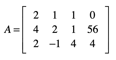 为了便于后面的回代计算,我们也可以把方程式等号右边的值加入到系数矩阵,我们称这个新的矩阵为增广矩阵,我把这个矩阵记为$A$。