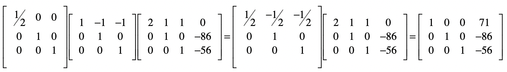 观察一下现在的方程组,第一个方程有3个自变量,第二个方程有2个自变量,第三个方程只有1个自变量。这个时候,我们就可以从第三个方程开始,开始回代的过程了。通过第三个方程,显然我们可以得到$x_3=-56$,然后把这个值代入第二个方程,就可以得到$x_2 = -86$。最后把$x_2$和$x_3$的值代入第一个方程式,我们可以得到$x_1=71$。