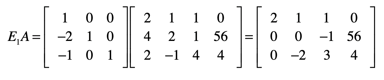 因此,我们可使用下面这个矩阵$E1$和$A$的点乘,来实现消除第二个和第三个方程式中$x_1$的目的。