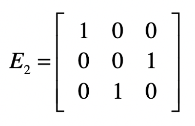 下一步是消除第三个方程中的$x_2$。依照之前的经验,我们要把第二个方程式作为“主元行”,来消除第三个方程中的$x_2$。可是第二个方程中的$x_2$已经没有了,失去了参照,这个时候我们需要把第二个方程和第三个方程互换。这种互换的操作如何使用矩阵来实现呢?其实不难,例如使用下面这个矩阵$E2$左乘增广矩阵$A$。