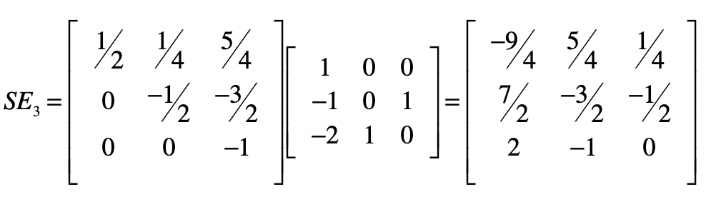 我们把这个矩阵记作$SE$,把乘以最初的系数矩阵$B$,就得到了一个单位矩阵。根据逆矩阵的定义,$SE$就是$B$的逆矩阵。换个角度来思考,使用消元法进行线性方程组求解的过程,就是在找系数矩阵的逆矩阵的过程。
