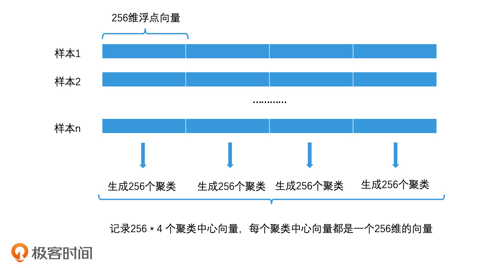 如果我们的样本向量都是1024维的浮点数向量,那我们可以将它分为4段,这样每一段就都是一个256维的浮点向量。然后,在每一段的256维的空间里,我们用聚类算法将这256维空间再划分为256个聚类。接着,我们可以用1至256作为ID,来为这256个聚类中心编号。这样,我们就得到了256 * 4 共1024个聚类中心,每个聚类中心都是一个256维的浮点数向量(256 * 4字节 = 1024字节)。最后,我们将这1024个聚类中心向量都存储下来。