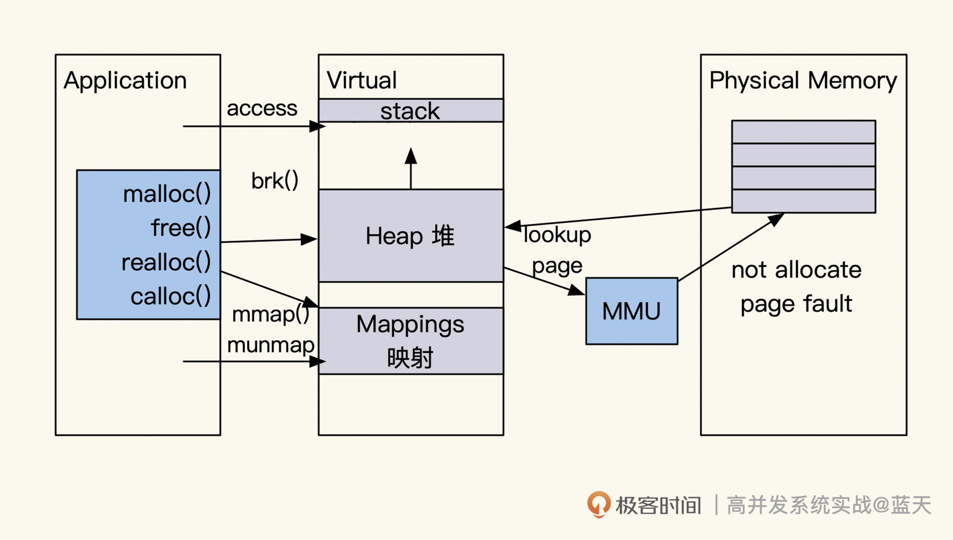 所以,当我们确认需要高并发读写内存时,都会先申请一大块内存并填0,然后再使用,这样可以减少数据插入时产生的大量缺页中断。我额外补充一个注意事项,这种申请大内存并填0的操作很慢,尽量在服务启动时去做。