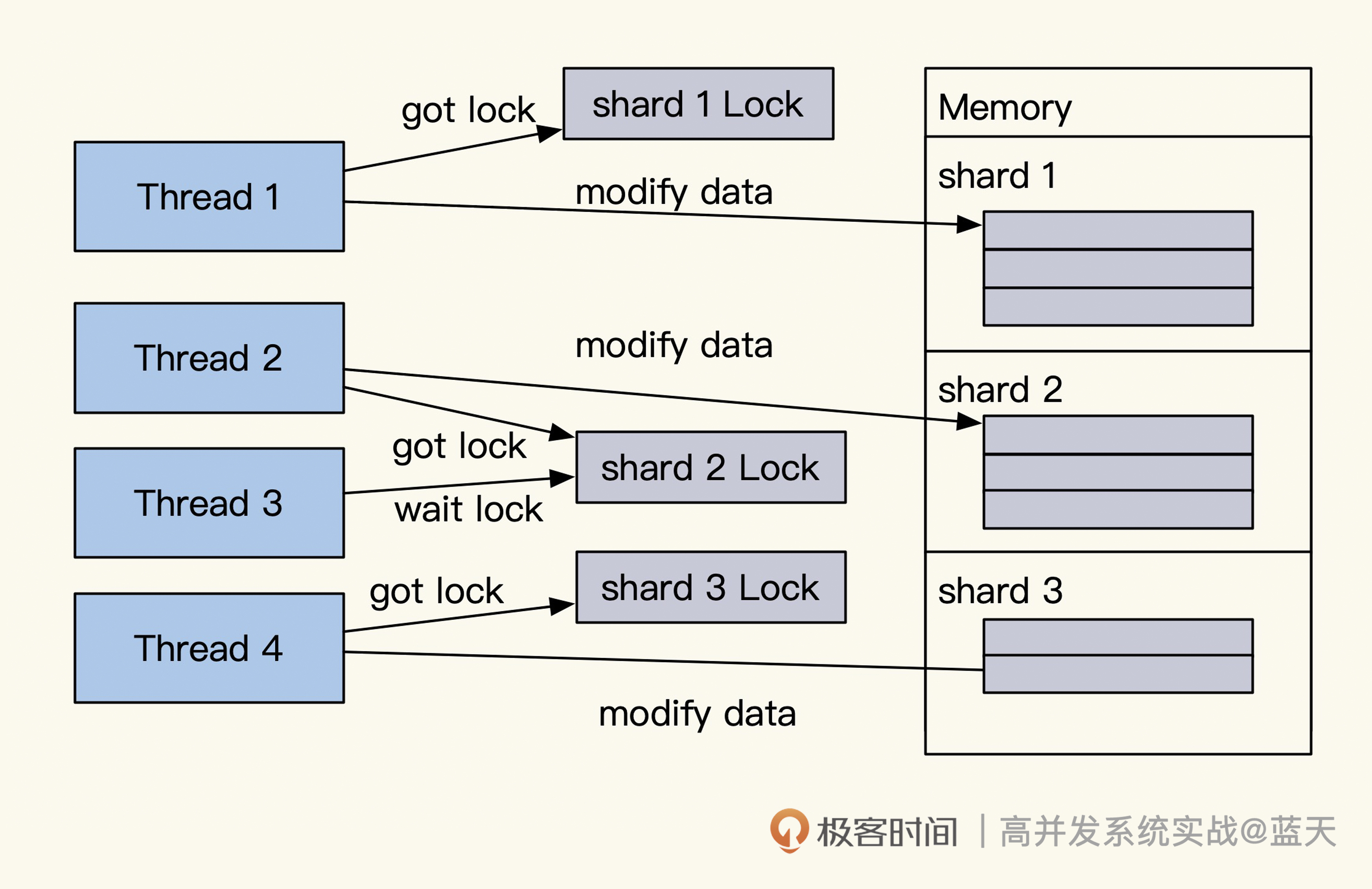 如果读写频繁,我们常常会对相应的struct增加单条数据锁或map锁。但你要注意,锁粒度太大会影响到我们的服务性能。
